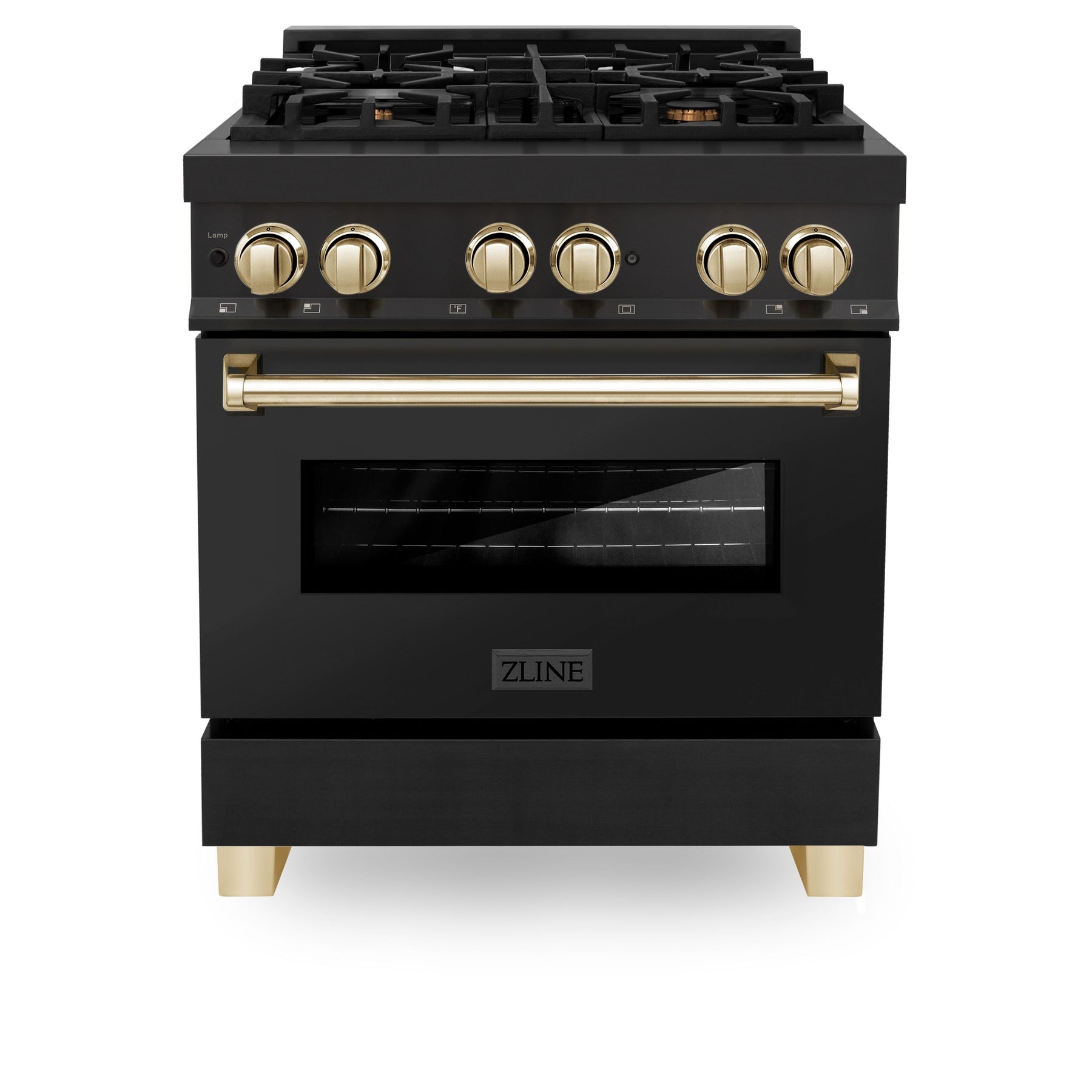 - ZLINE Autograph Edition 30 In. 4.0 cu. ft. with Gas Stove and Electric Oven in Black Stainless Steel with Gold Accents, RABZ-30-G
