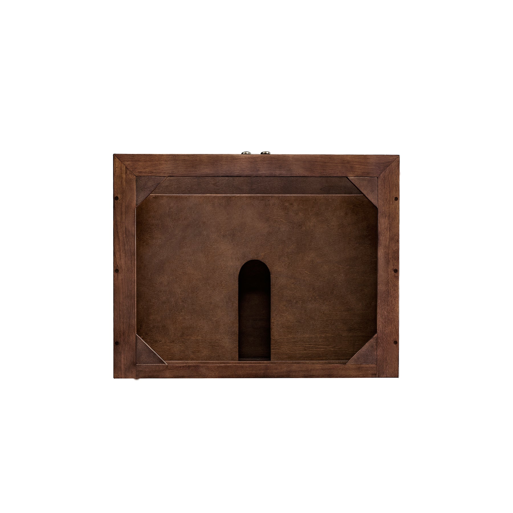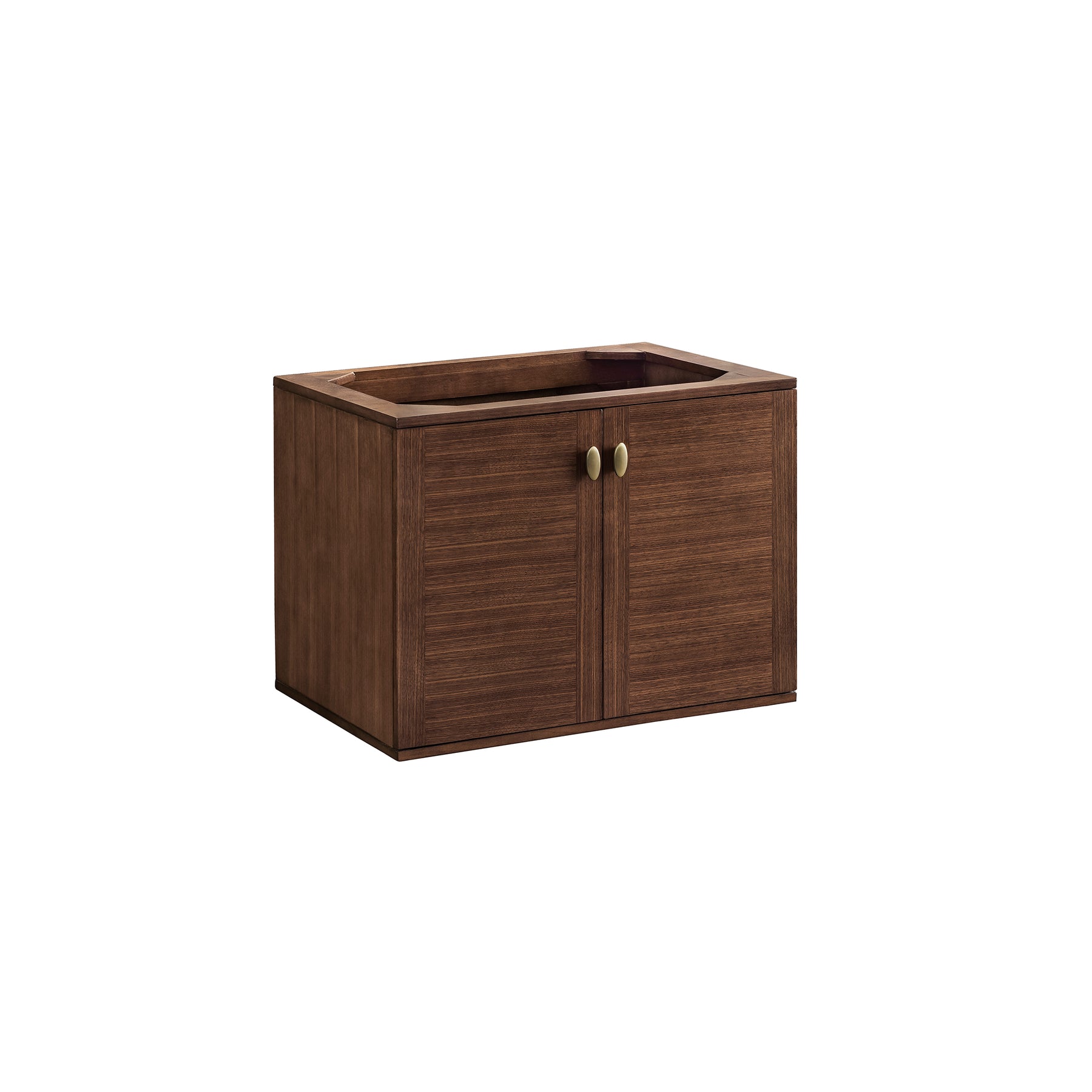 The 30" Amberly Single Vanity celebrates Mid-Century simplistic forms and finish details combined with practical function. The beauty of the natural grains in the walnut veneer steals the show, while the decorative, oval knobs in Champagne Brass provide the perfect accent. This two-door cabinet opens to a spacious interior with a single shelf and a convenient USB/Electric power outlet. The elegant wood base elevates the Vanity Cabinet in a true console style, though you may choose the more modern, space-saving wall-mount option. This vanity ships complete with the wood base and hardware for both mounting options.