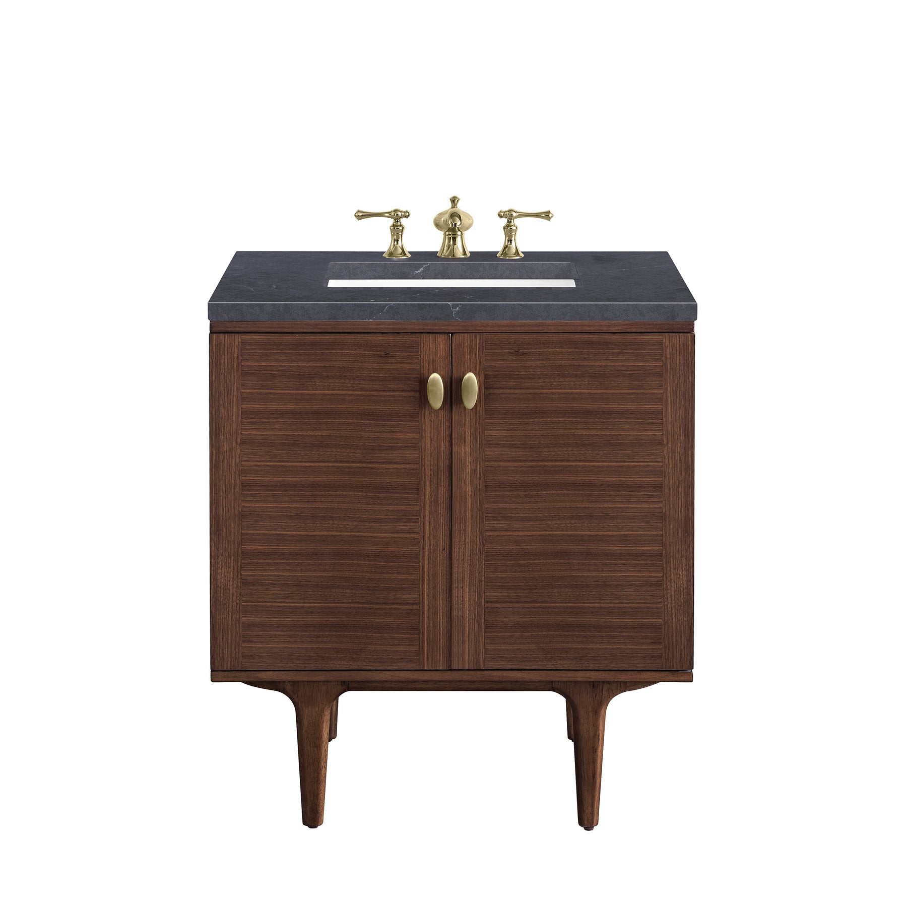 The 30" Amberly Single Vanity celebrates Mid-Century simplistic forms and finish details combined with practical function. The beauty of the natural grains in the walnut veneer steals the show, while the decorative, oval knobs in Champagne Brass provide the perfect accent. This two-door cabinet opens to a spacious interior with a single shelf and a convenient USB/Electric power outlet. The elegant wood base elevates the Vanity Cabinet in a true console style, though you may choose the more modern, space-saving wall-mount option. The 3 cm, eased edge Charcoal Soapstone Silestone top completes the look.