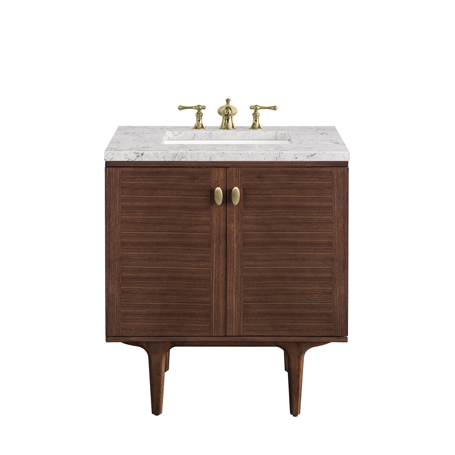 The 30" Amberly Single Vanity celebrates Mid-Century simplistic forms and finish details combined with practical function. The beauty of the natural grains in the walnut veneer steals the show, while the decorative, oval knobs in Champagne Brass provide the perfect accent. This two-door cabinet opens to a spacious interior with a single shelf and a convenient USB/Electric power outlet. The elegant wood base elevates the Vanity Cabinet in a true console style, though you may choose the more modern, space-saving wall-mount option. The 3 cm, eased edge Eternal Jasmine Pearl Silestone top completes the look.