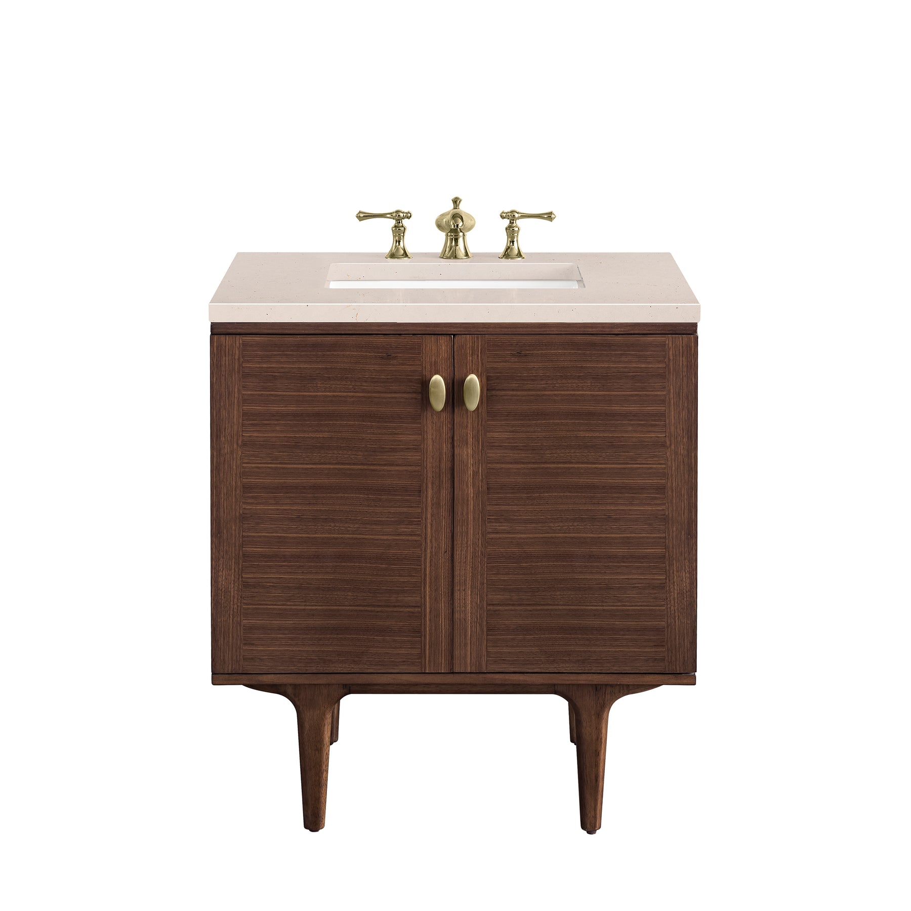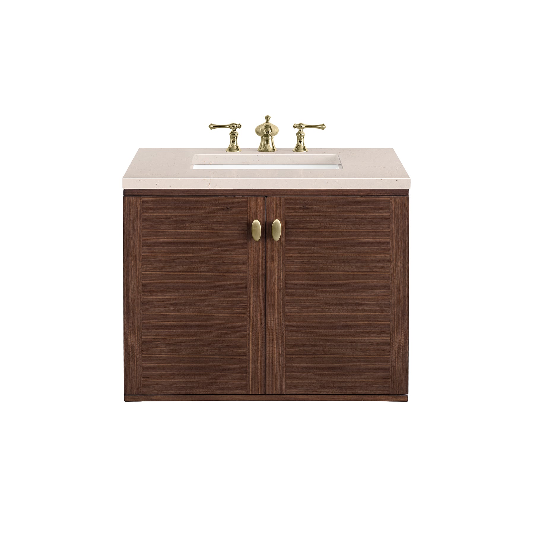 The 30" Amberly Single Vanity celebrates Mid-Century simplistic forms and finish details combined with practical function. The beauty of the natural grains in the walnut veneer steals the show, while the decorative, oval knobs in Champagne Brass provide the perfect accent. This two-door cabinet opens to a spacious interior with a single shelf and a convenient USB/Electric power outlet. The elegant wood base elevates the Vanity Cabinet in a true console style, though you may choose the more modern, space-saving wall-mount option. The 3 cm, eased edge Eternal Marfil Silestone top completes the look.