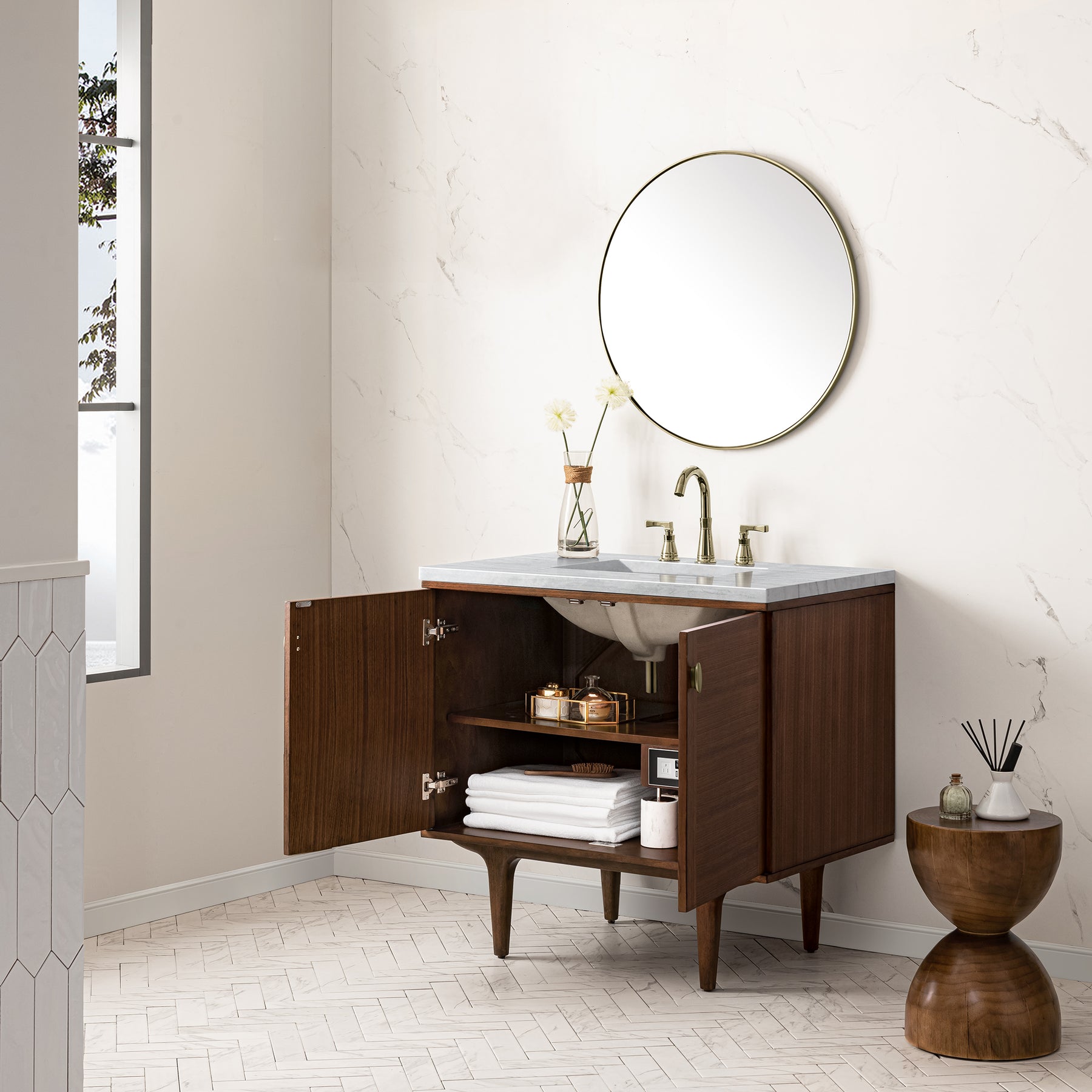 The 36" Amberly Single Vanity celebrates Mid-Century simplistic forms and finish details combined with practical function. The beauty of the natural grains in the walnut veneer steals the show, while the decorative, oval knobs in Champagne Brass provide the perfect accent. This two-door cabinet opens to a spacious interior with a single shelf and a convenient USB/Electric power outlet. The elegant wood base elevates the Vanity Cabinet in a true console style, though you may choose the more modern, space-saving wall-mount option. The 3 cm, eased edge Arctic Fall Solid Surface top completes the look.