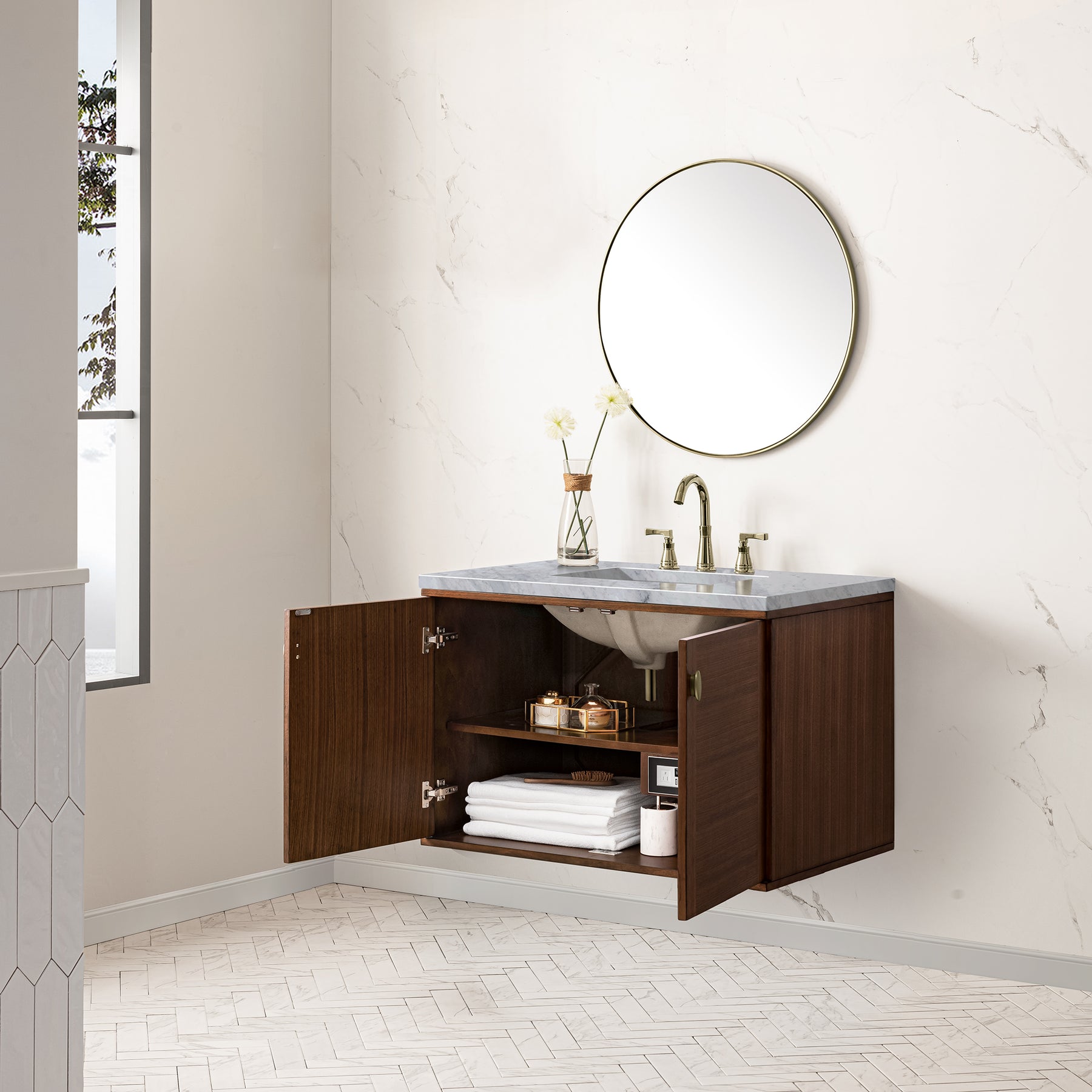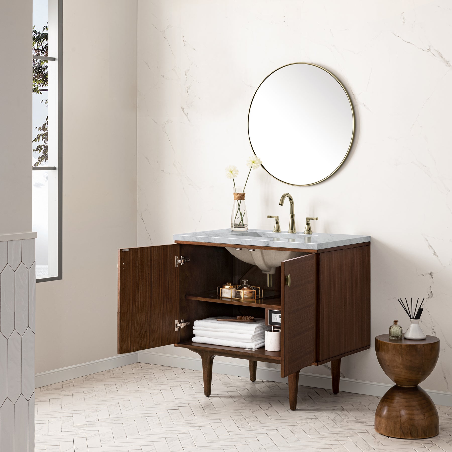 The 36" Amberly Single Vanity celebrates Mid-Century simplistic forms and finish details combined with practical function. The beauty of the natural grains in the walnut veneer steals the show, while the decorative, oval knobs in Champagne Brass provide the perfect accent. This two-door cabinet opens to a spacious interior with a single shelf and a convenient USB/Electric power outlet. The elegant wood base elevates the Vanity Cabinet in a true console style, though you may choose the more modern, space-saving wall-mount option. The 3 cm, eased-edge Carrara marble top completes the look.
