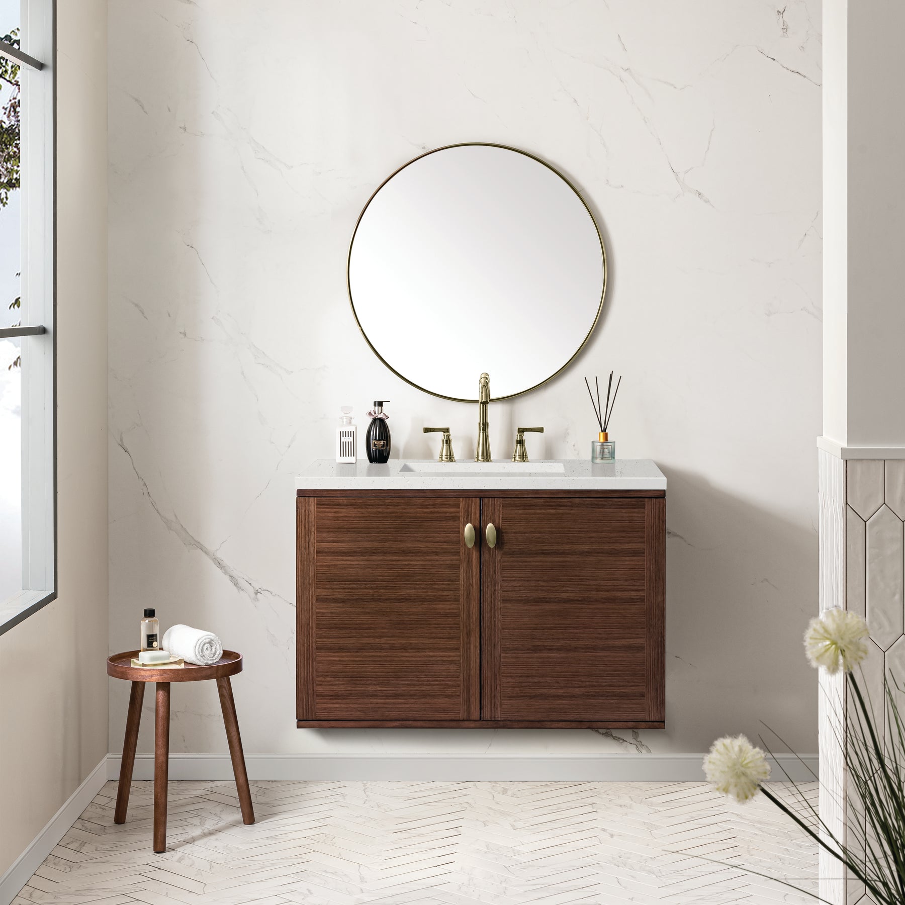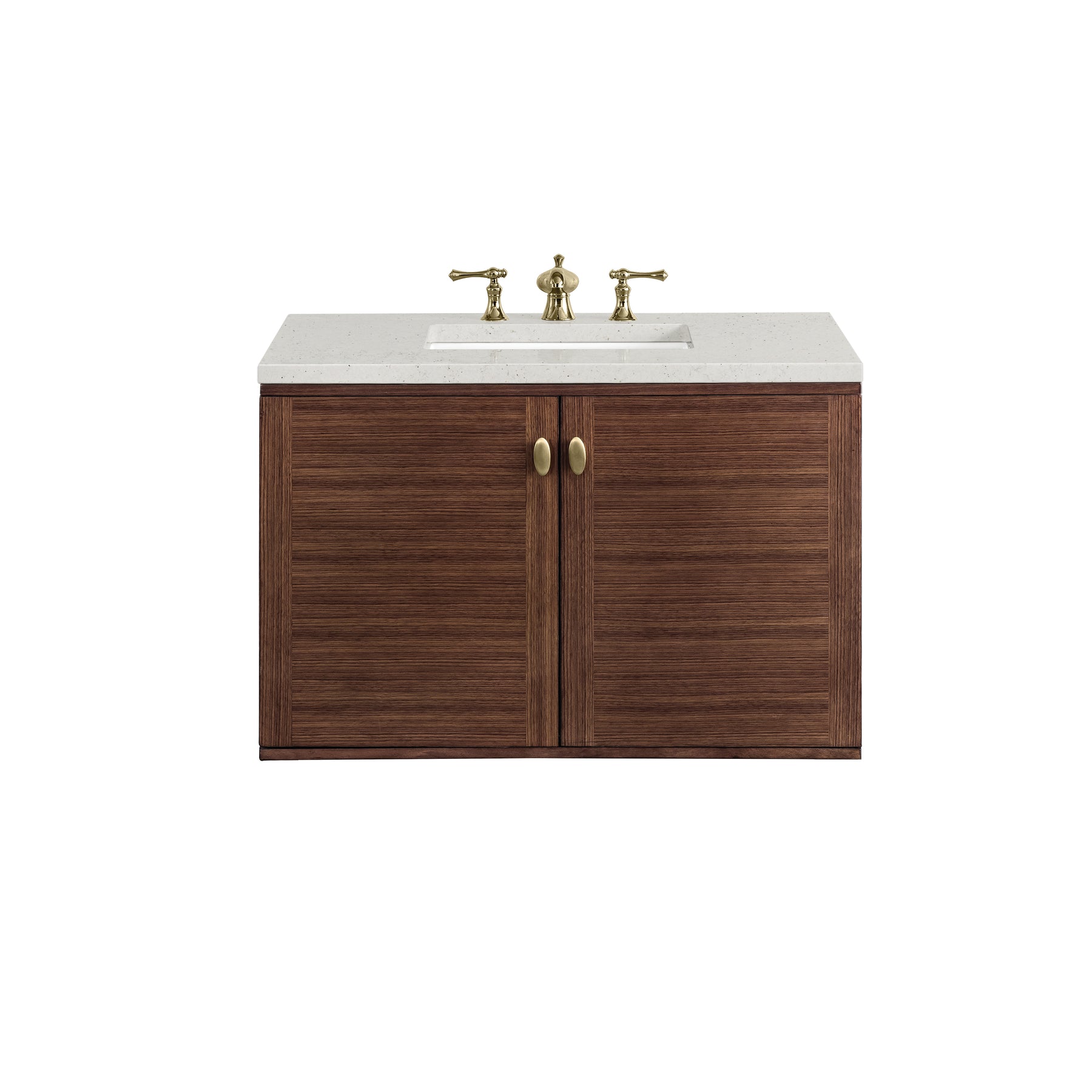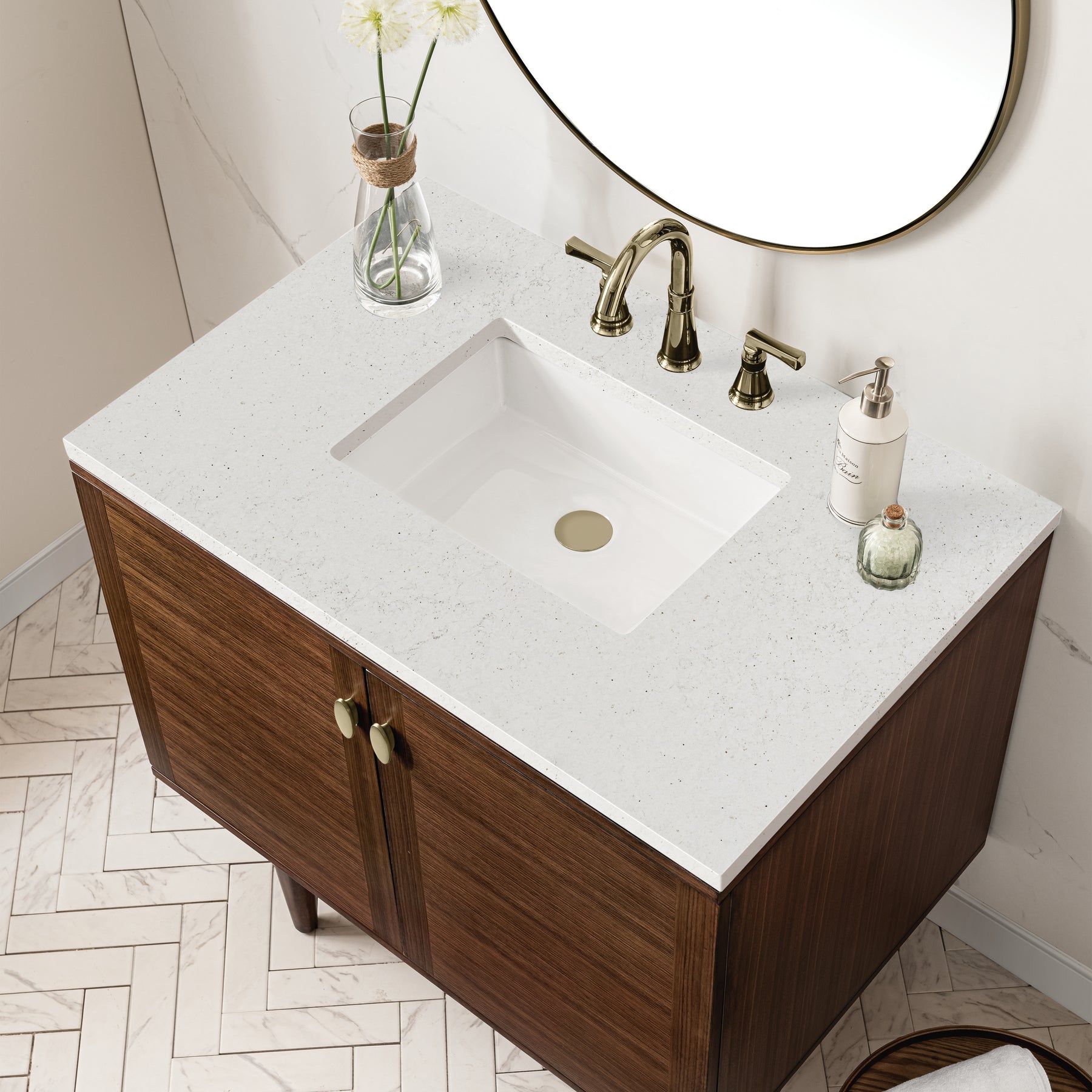 The 36" Amberly Single Vanity celebrates Mid-Century simplistic forms and finish details combined with practical function. The beauty of the natural grains in the Walnut veneer steals the show, while the decorative, oval knobs in Champagne Brass provide the perfect accent. This two-door cabinet opens to a spacious interior with a single shelf and a convenient USB/Electric power outlet. The elegant wood base elevates the vanity cabinet in a true console style, though you may choose the more modern, space-saving wall-mount option. The Lime Delight Silestone top lends warm, textured beige tones to perfectly complement the finish on the vanity.