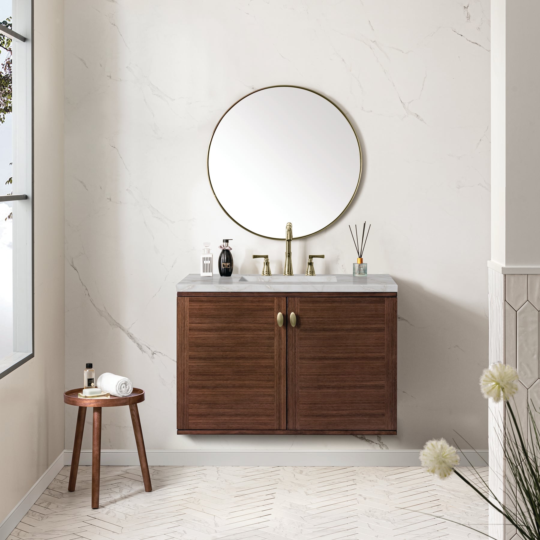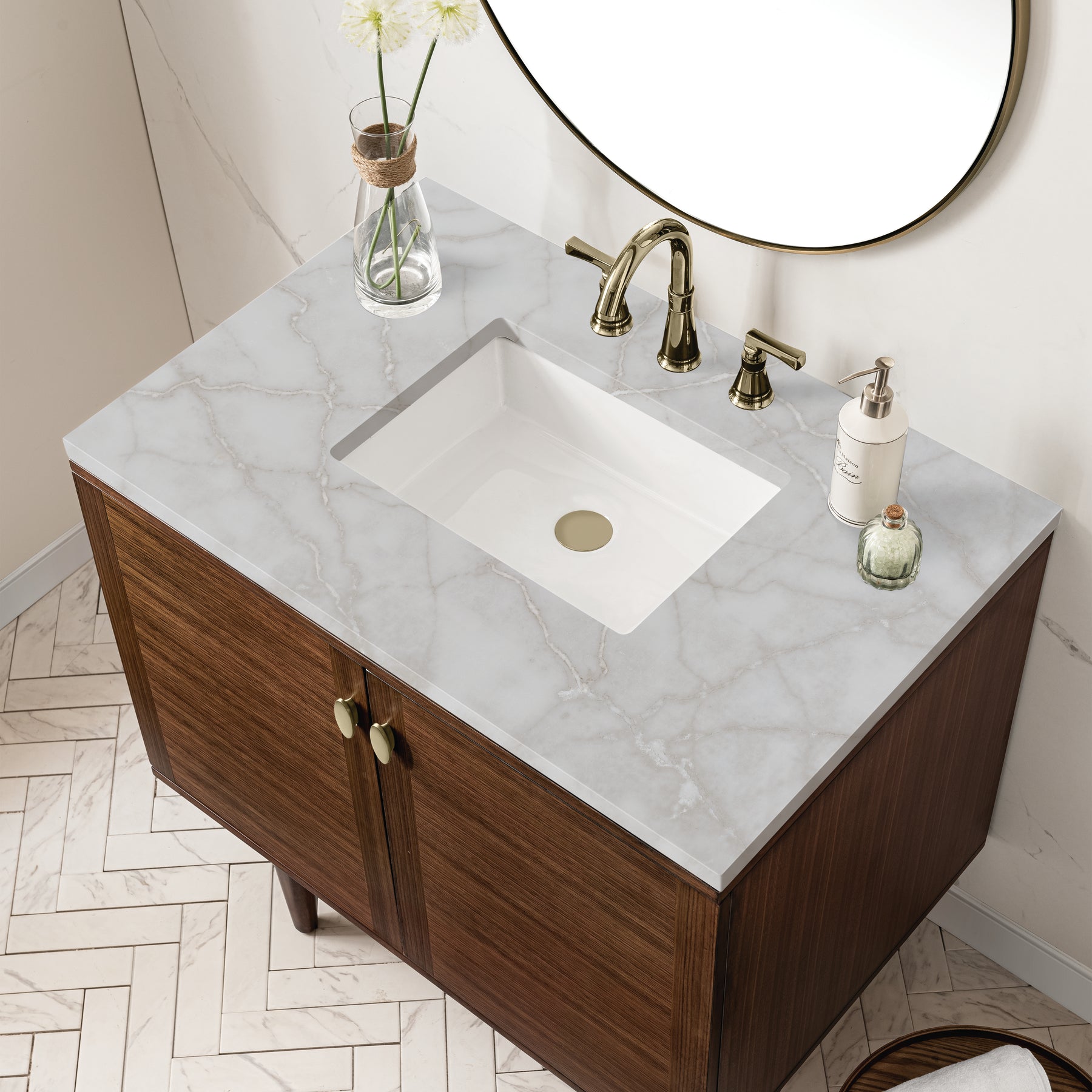 The 36" Amberly Single Vanity celebrates Mid-Century simplistic forms and finish details combined with practical function. The beauty of the natural grains in the Walnut veneer steals the show, while the decorative, oval knobs in Champagne Brass provide the perfect accent. This two-door cabinet opens to a spacious interior with a single shelf and a convenient USB/Electric power outlet. The elegant wood base elevates the vanity cabinet in a true console style, though you may choose the more modern, space-saving wall-mount option. The Mid-Century Walnut finish is accented by the neutral background of the Victorian Silver Silestone top, boasting champagne metallic accents which seamlessly complement wood tones.