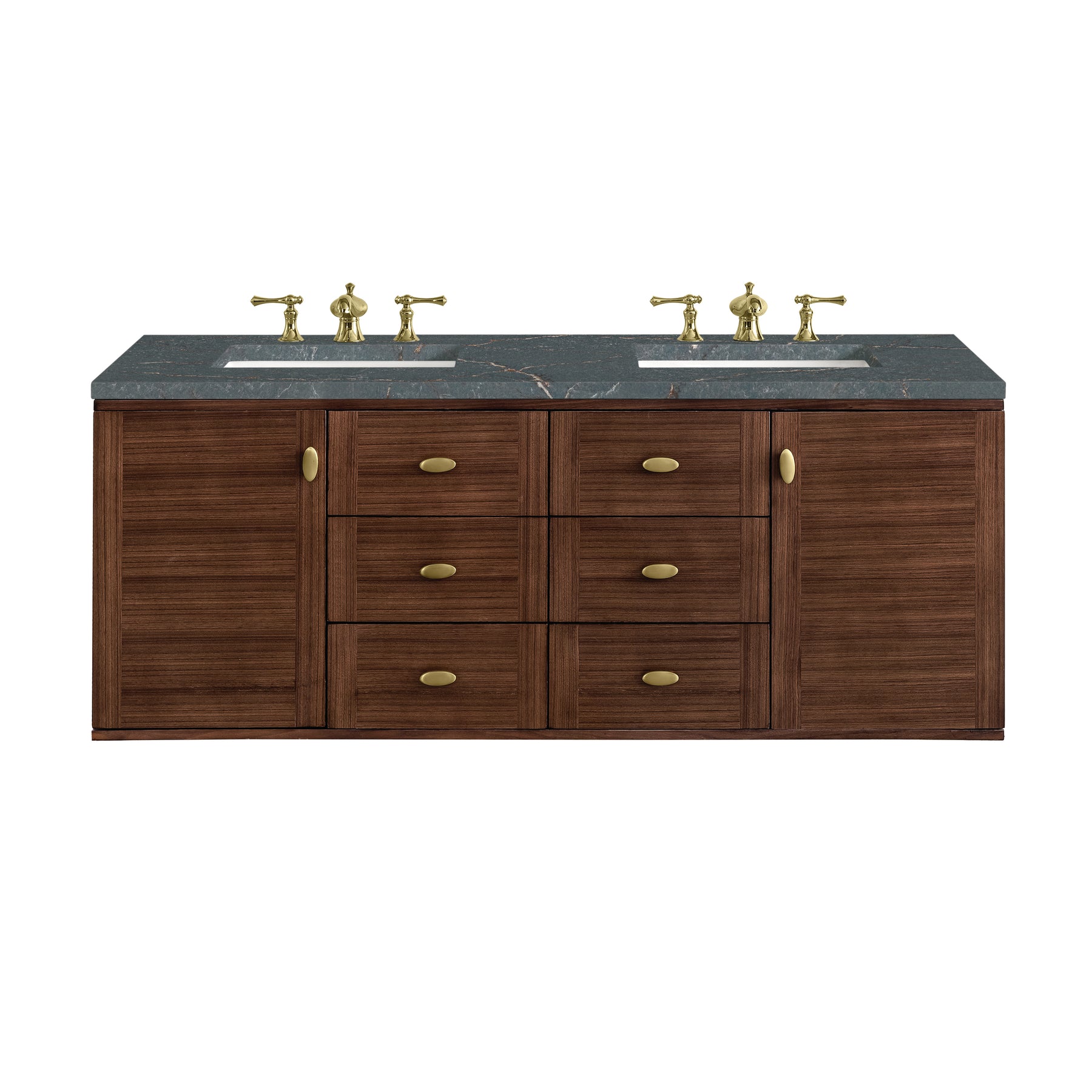 The 60" Amberly Double Vanity celebrates Mid-Century simplistic forms and finish details combined with practical function. The beauty of the natural grains in the Walnut veneer steals the show, while the decorative, oval knobs in Champagne Brass provide the perfect accent. This two-door cabinet opens to spacious interior storage with adjustable shelves and a convenient USB/Electric power outlet. Six drawers provide ample storage and include one removable bamboo organizer. The top row drawers are tip-out style. The elegant wood base elevates the vanity cabinet in a true console style, though you may choose the more modern, space-saving wall-mount option. The Mid-Century Walnut finish is enhanced by the Parisien Bleu Silestone top, offering a deep bluish hue with broad and intricate neutral veins highlighted by fine coppery accents.
