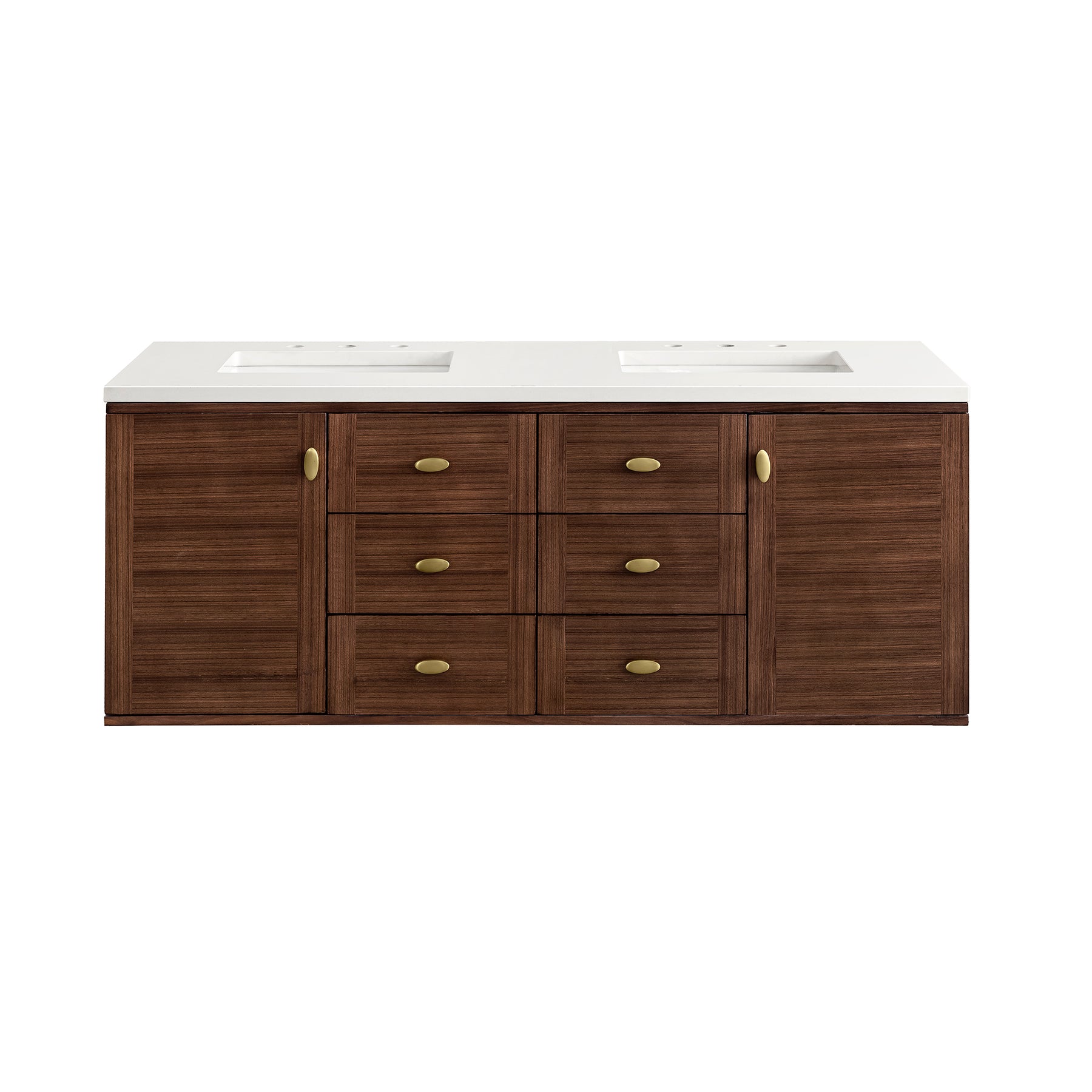 The 60" Amberly Double Vanity celebrates Mid-Century simplistic forms and finish details combined with practical function. The beauty of the natural grains in the walnut veneer steals the show, while the decorative, oval knobs in Champagne Brass provide the perfect accent. This two-door cabinet opens to spacious interior storage with adjustable shelves and a convenient USB/Electric power outlet. Six drawers provide ample storage and include one removable bamboo organizer. The top row drawers are tip-out style. The elegant wood base elevates the Vanity Cabinet in a true console style, though you may choose the more modern, space-saving wall-mount option. The 3 cm, eased edge Eternal Jasmine Pearl Silestone top completes the look.