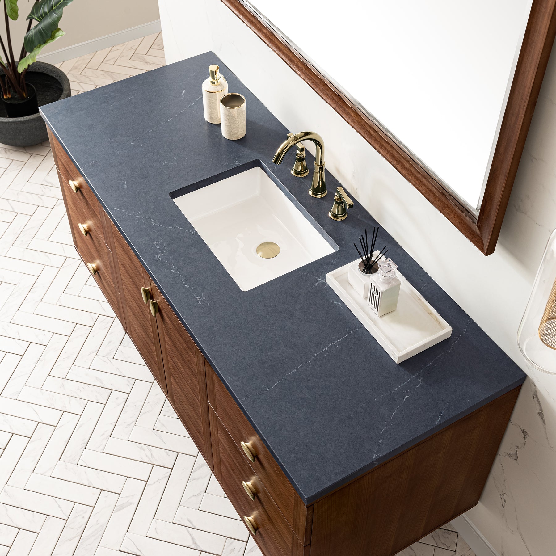 The 60" Amberly Single Vanity celebrates Mid-Century simplistic forms and finish details combined with practical function. The beauty of the natural grains in the walnut veneer steals the show, while the decorative, oval knobs in Champagne Brass provide the perfect accent. This two-door cabinet opens to a spacious interior with a single shelf and a convenient USB/Electric power outlet. Six drawers provide ample storage and include one removable bamboo organizer. The elegant wood base elevates the Vanity Cabinet in a true console style, though you may choose the more modern, space-saving wall-mount option. The 3 cm, eased-edge Charcoal Soapstone Silestone top completes the look.