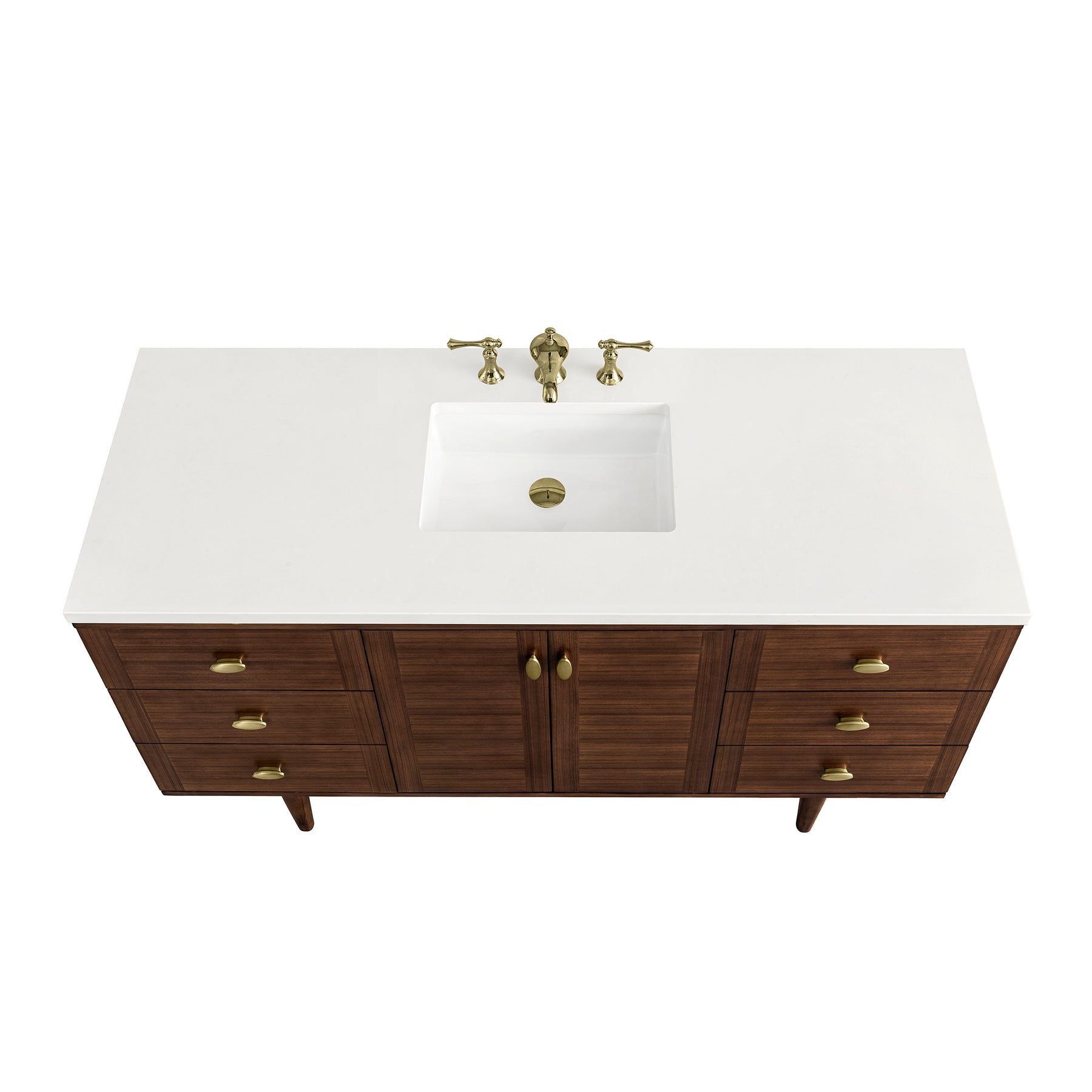 The 60" Amberly Single Vanity celebrates Mid-Century simplistic forms and finish details combined with practical function. The beauty of the natural grains in the walnut veneer steals the show, while the decorative, oval knobs in Champagne Brass provide the perfect accent. This two-door cabinet opens to a spacious interior with a single shelf and a convenient USB/Electric power outlet. Six drawers provide ample storage and include one removable bamboo organizer. The elegant wood base elevates the Vanity Cabinet in a true console style, though you may choose the more modern, space-saving wall-mount option. The 3 cm, eased edge Eternal Jasmine Pearl Silestone top completes the look.