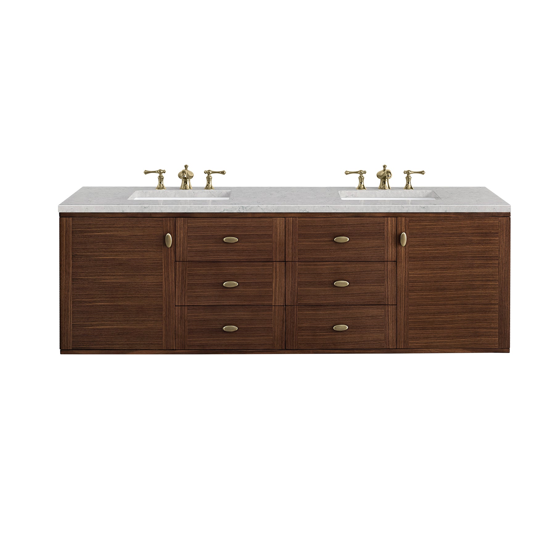 The Amberly 72" Double Vanity by James Martin Vanities celebrates Mid-Century Modern design by combining beautiful details with practical function. The beauty of the natural wood grain of the rich walnut veneers steal the show, while the decorative, oval knobs in Champagne Brass provide the perfect accent. This vanity features two single-door cabinets that open to interior shelves, four drawers, and two tip-out drawers. A convenient USB/120V power outlet and removable drawer organizer are also included. The rich walnut cabinet sits atop a wood base with tapered legs, completing the Mid-Century Modern look, but can be removed for a more modern, space-saving wall-mount option. The cabinet is topped with a beautiful 3cm Eternal Jasmine Pearl Silestone® top.