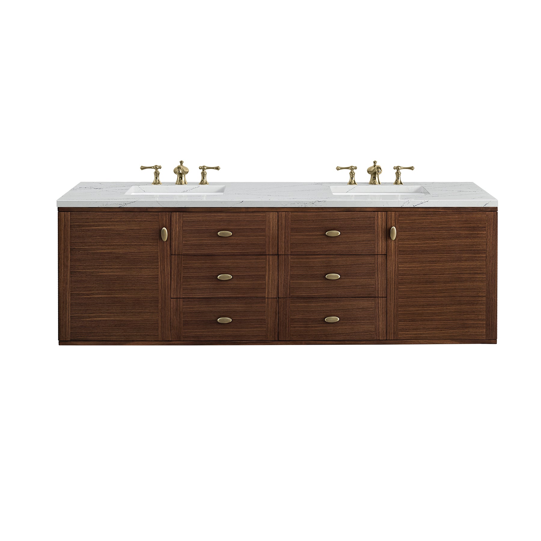 The Amberly 72" Double Vanity by James Martin Vanities celebrates Mid-Century Modern design by combining beautiful details with practical function. The beauty of the natural wood grain of the rich walnut veneers steal the show, while the decorative, oval knobs in Champagne Brass provide the perfect accent. This vanity features two single-door cabinets that open to interior shelves, four drawers, and two tip-out drawers. A convenient USB/120V power outlet and removable drawer organizer are also included. The rich walnut cabinet sits atop a wood base with tapered legs, completing the Mid-Century Modern look, but can be removed for a more modern, space-saving wall-mount option. The cabinet is topped with a striking 3cm Ethereal Noctis Silestone® top.