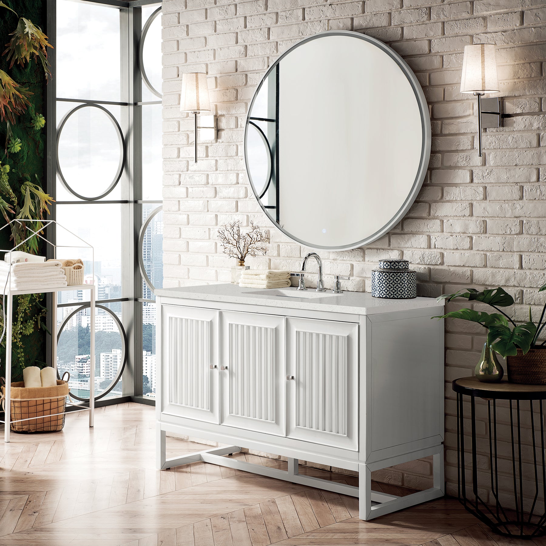 Customize your space with the Athens 48” Glossy White Single Vanity by James Martin Vanities. Part of the larger Athens modular collection, this incredible Vanity boasts an impressive amount of storage space and combines traditional charm with modern functionality. Premium standard features include soft-close undermount drawer glides and adjustable door hinges, brushed aluminum laminate drawer bottoms, and one bamboo drawer organizer. . The Lime Delight Silestone top lends warm, textured beige tones to perfectly complement the wood finish on the vanity.