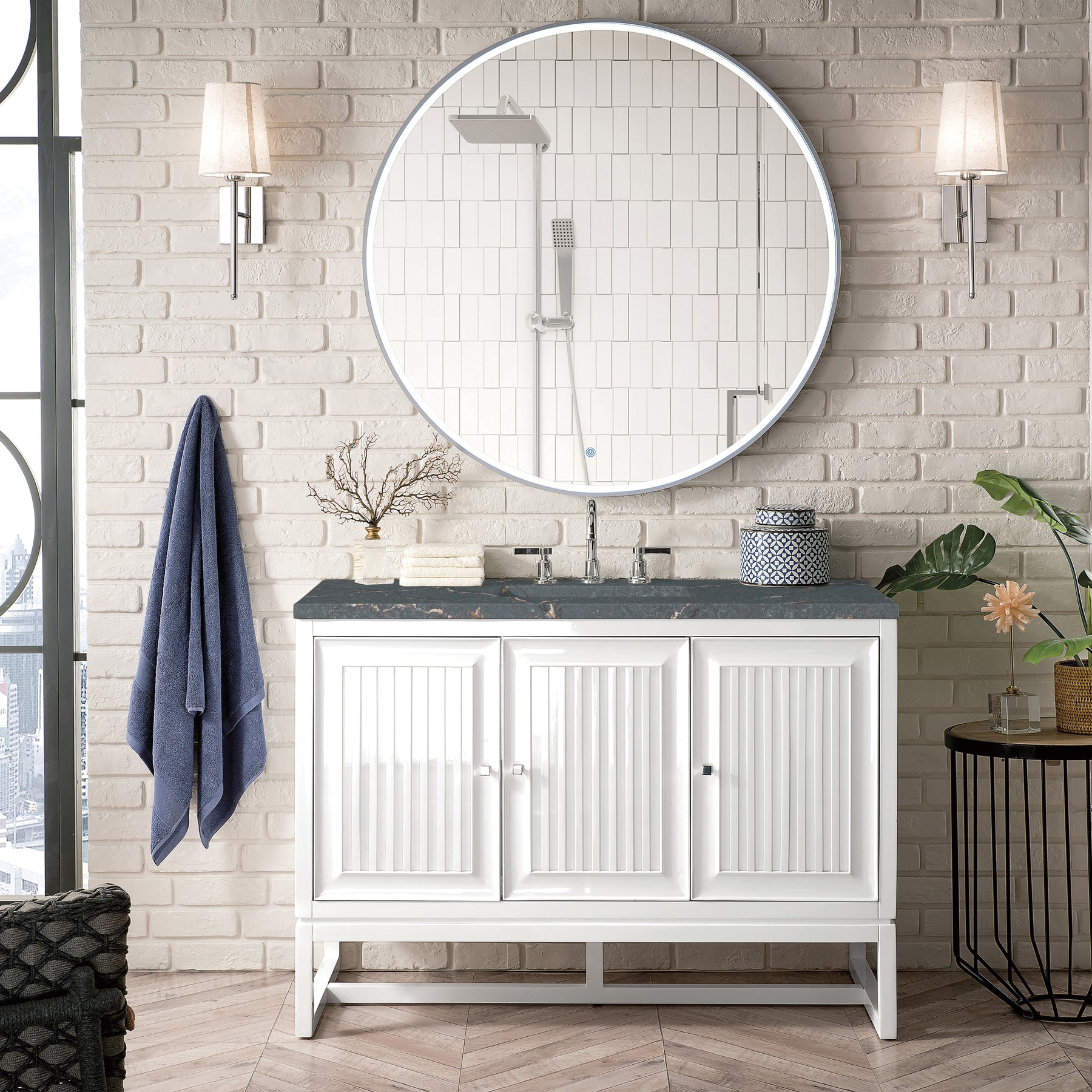 Customize your space with the Athens 48” Glossy White Single Vanity by James Martin Vanities. Part of the larger Athens modular collection, this incredible Vanity boasts an impressive amount of storage space and combines traditional charm with modern functionality. Premium standard features include soft-close undermount drawer glides and adjustable door hinges, brushed aluminum laminate drawer bottoms, and one bamboo drawer organizer. The Bright White finish is enhanced by the Parisien Bleu Silestone top, offering a deep bluish hue with broad and intricate neutral veins highlighted by fine coppery accents.