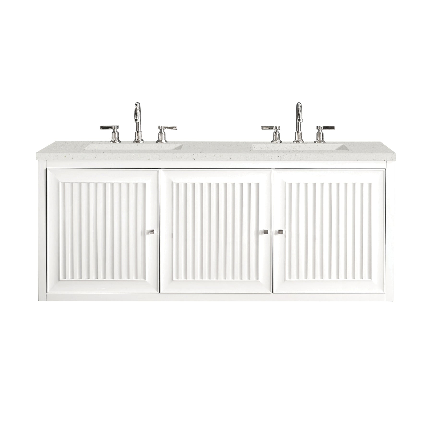 Customize your space with the Athens 60” Glossy White Double Vanity by James Martin Vanities. Part of the larger Athens modular collection, this incredible Vanity boasts an impressive amount of storage space and combines traditional charm with modern functionality. Premium standard features include soft-close undermount drawer glides and adjustable door hinges, brushed aluminum laminate drawer bottoms, and one bamboo drawer organizer. . The Lime Delight Silestone top lends warm, textured beige tones to perfectly complement the wood finish on the vanity.