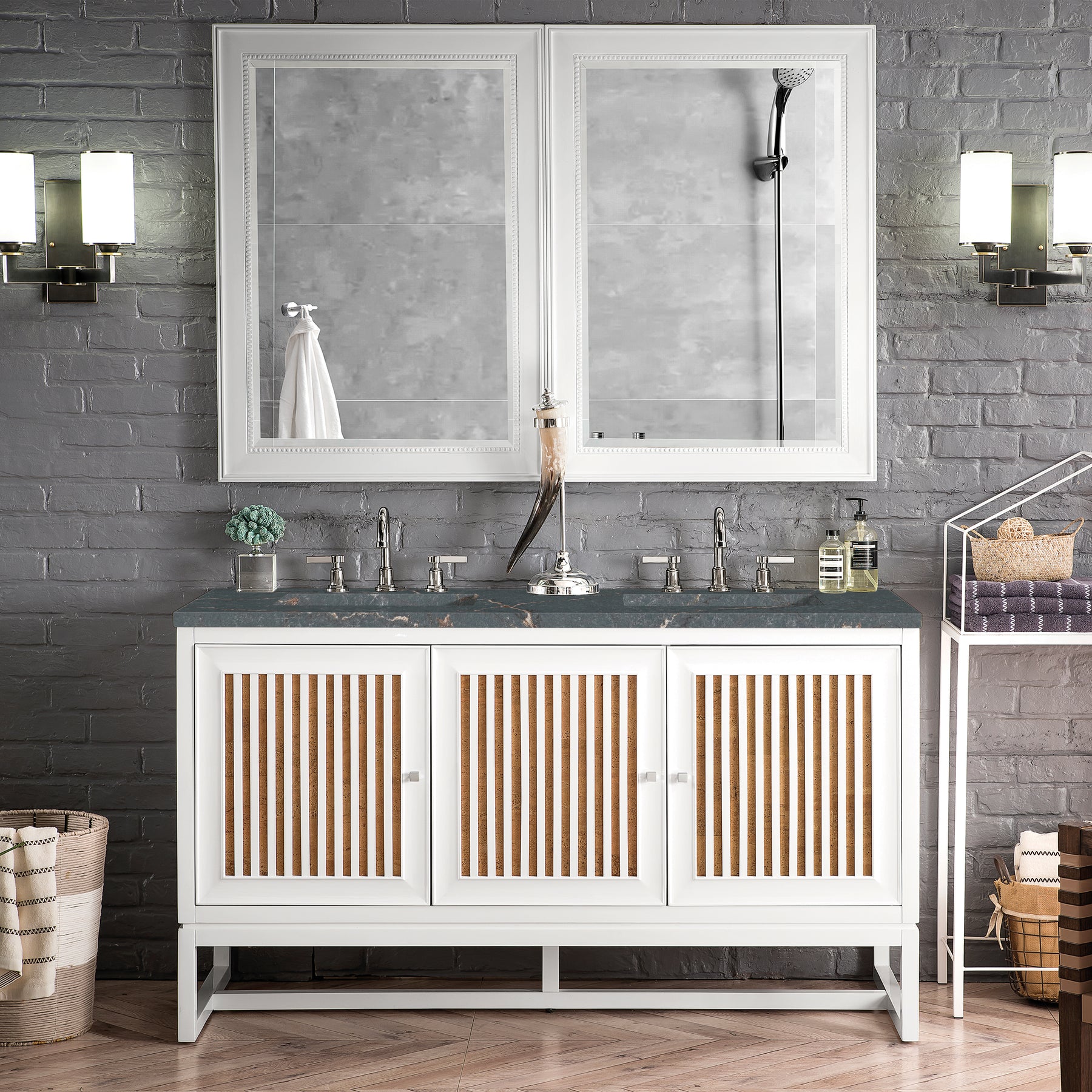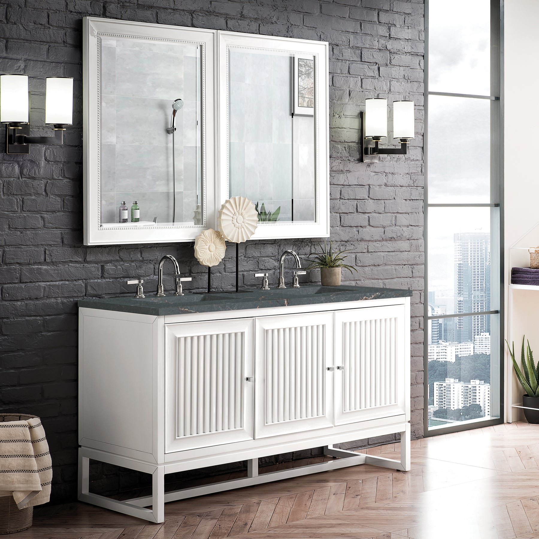 Customize your space with the Athens 60” Glossy White Double Vanity by James Martin Vanities. Part of the larger Athens modular collection, this incredible Vanity boasts an impressive amount of storage space and combines traditional charm with modern functionality. Premium standard features include soft-close undermount drawer glides and adjustable door hinges, brushed aluminum laminate drawer bottoms, and one bamboo drawer organizer. The Bright White finish is enhanced by the Parisien Bleu Silestone top, offering a deep bluish hue with broad and intricate neutral veins highlighted by fine coppery accents.