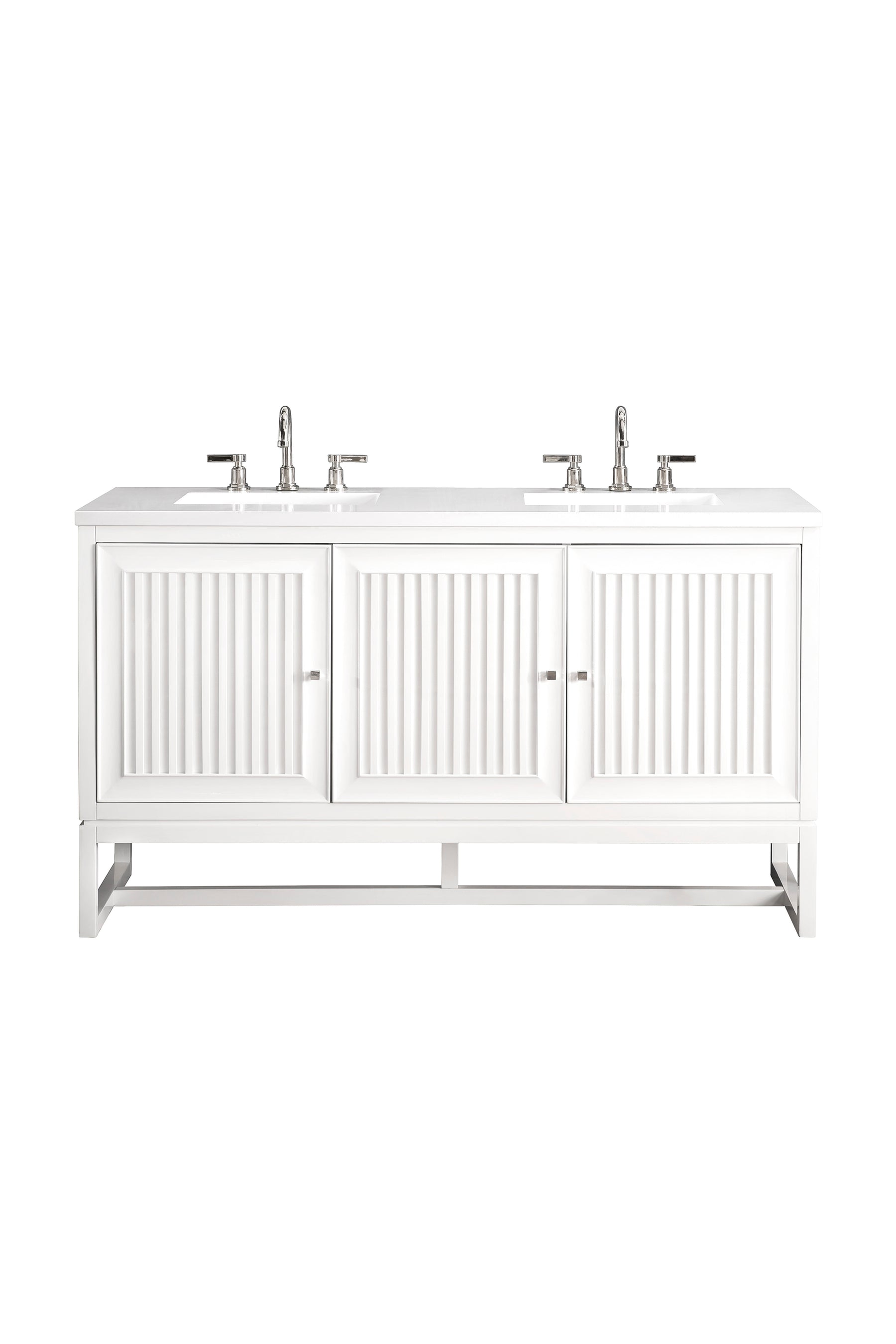 Bring a bit of the Greek Island home with the Athens 60” Glossy White Double Vanity by James Martin Vanities. Part of the larger Athens modular collection, this incredible Vanity boasts an impressive amount of storage space and combines traditional charm with modern functionality. Premium standard features include soft-close undermount drawer glides and adjustable door hinges, brushed aluminium laminate drawer bottoms, and one bamboo drawer organizer. The look is completed with a 3 CM eased edge White Zeus Silestone top and two white ceramic rectangular sinks.