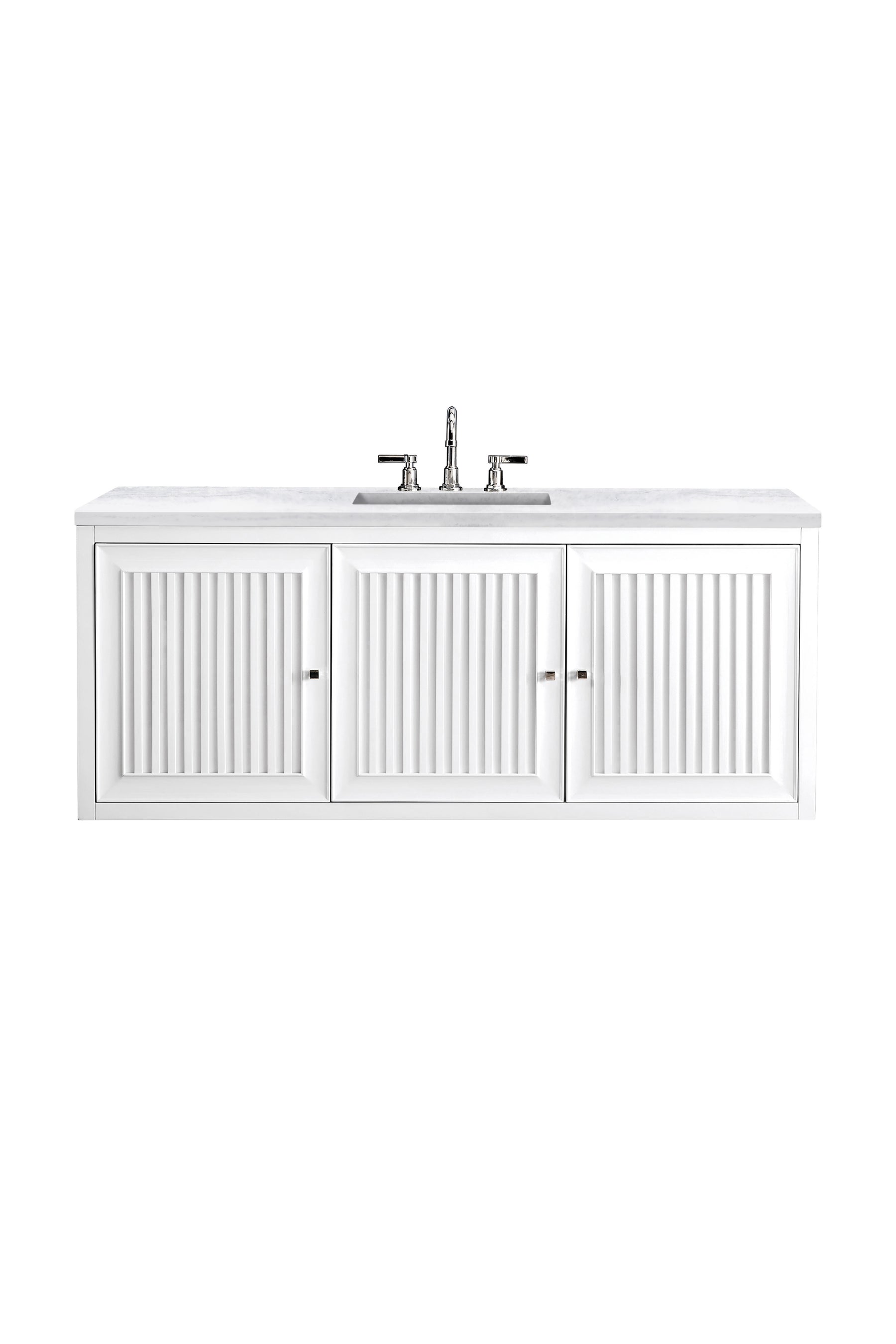 Bring a bit of the Greek Island home with the Athens 60” Glossy White Single Vanity by James Martin Vanities. Part of the larger Athens modular collection, this incredible Vanity boasts an impressive amount of storage space and combines traditional charm with modern functionality. Premium standard features include soft-close undermount drawer glides and adjustable door hinges, brushed aluminium laminate drawer bottoms, and one bamboo drawer organizer. The look is completed with a 3 CM eased edge Arctic Fall Solid Surface top and one white ceramic rectangular sink.