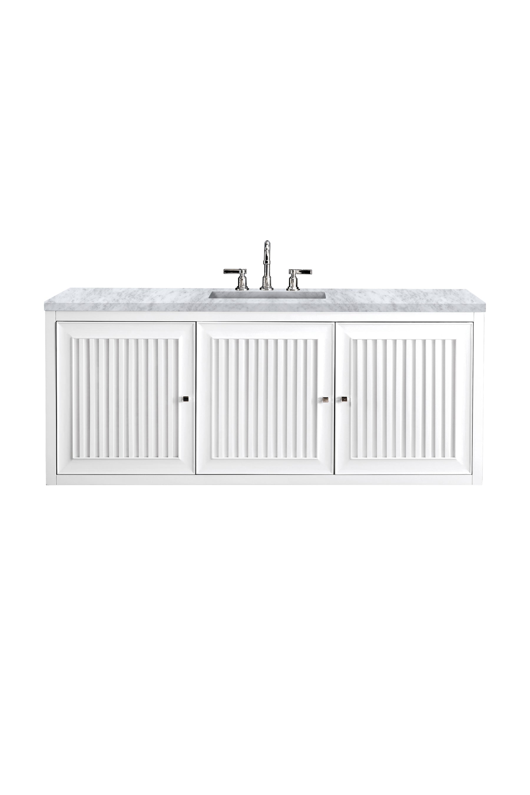 Bring a bit of the Greek Island home with the Athens 60” Glossy White Single Vanity by James Martin Vanities. Part of the larger Athens modular collection, this incredible Vanity boasts an impressive amount of storage space and combines traditional charm with modern functionality. Premium standard features include soft-close undermount drawer glides and adjustable door hinges, brushed aluminium laminate drawer bottoms, and one bamboo drawer organizer. The look is completed with a 3 CM eased edge Carrara Marble top and one white ceramic rectangular sink.