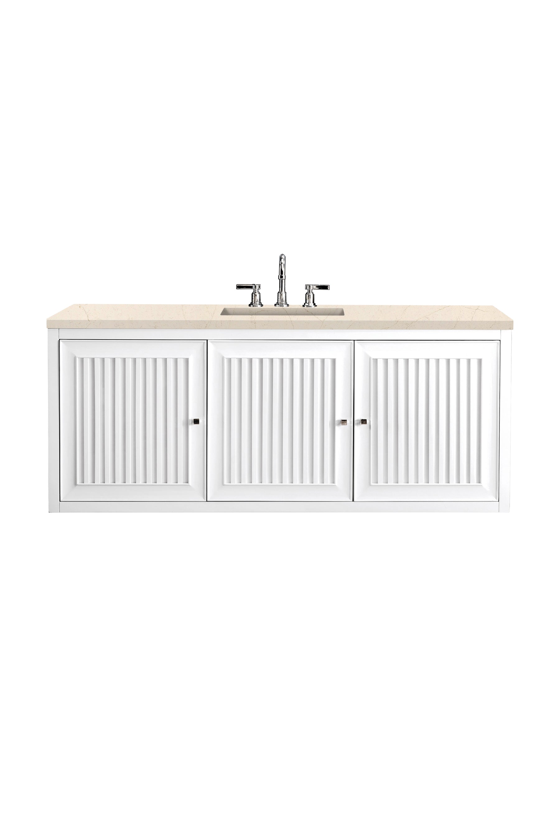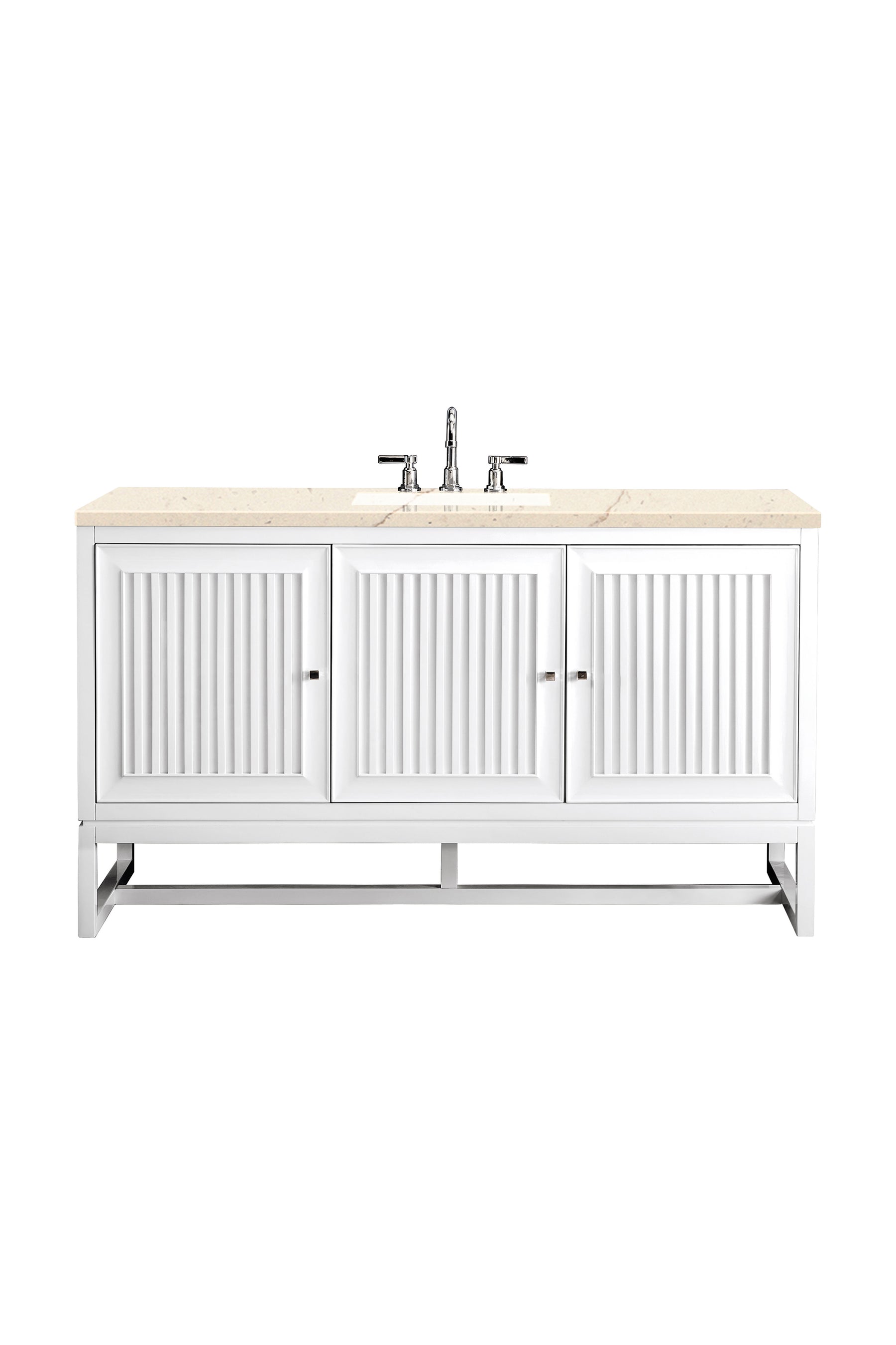 Bring a bit of the Greek Island home with the Athens 60” Glossy White Single Vanity by James Martin Vanities. Part of the larger Athens modular collection, this incredible Vanity boasts an impressive amount of storage space and combines traditional charm with modern functionality. Premium standard features include soft-close undermount drawer glides and adjustable door hinges, brushed aluminium laminate drawer bottoms, and one bamboo drawer organizer. The look is completed with a 3 CM eased edge Eternal Marfil Silestone top and one white ceramic rectangular sink.