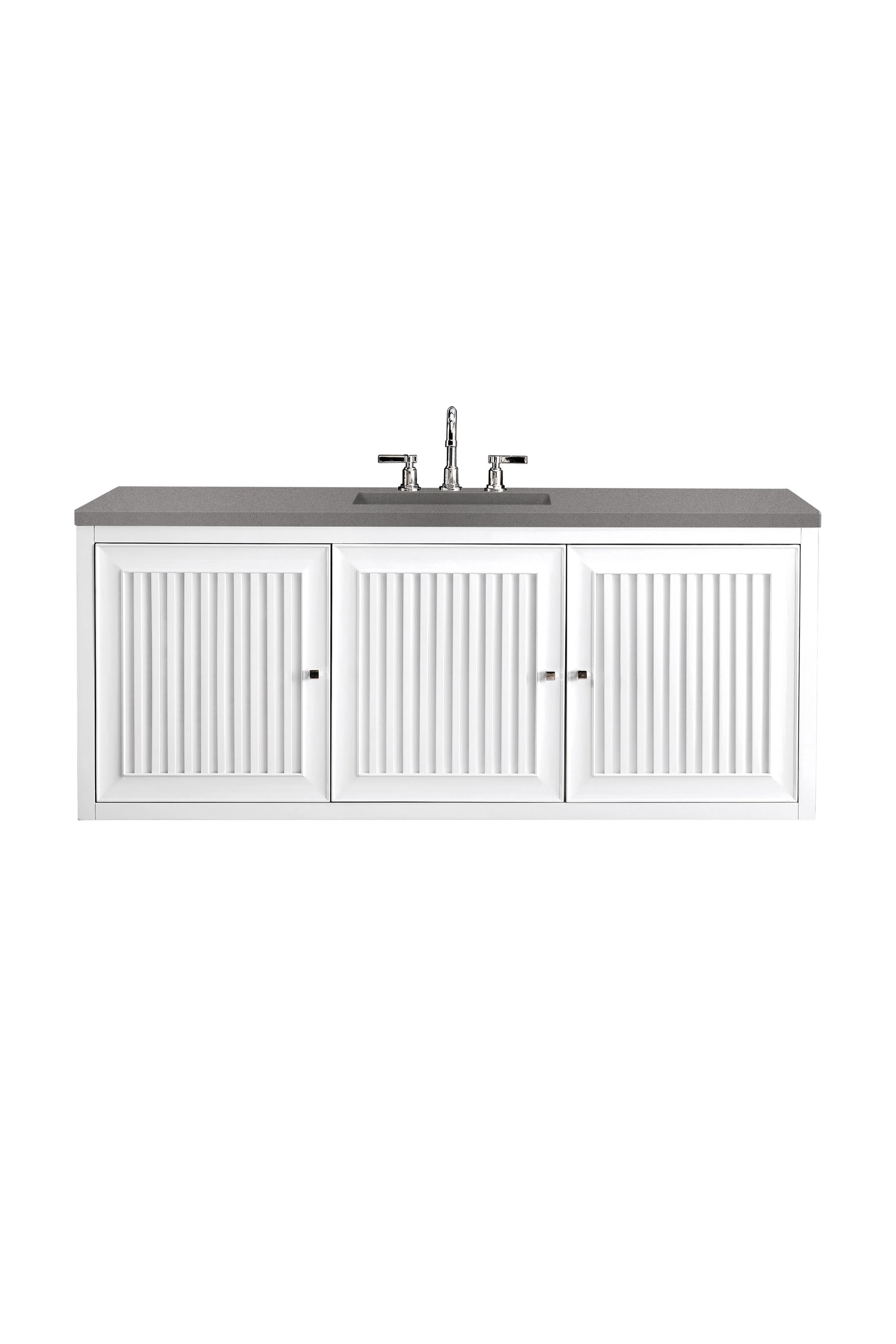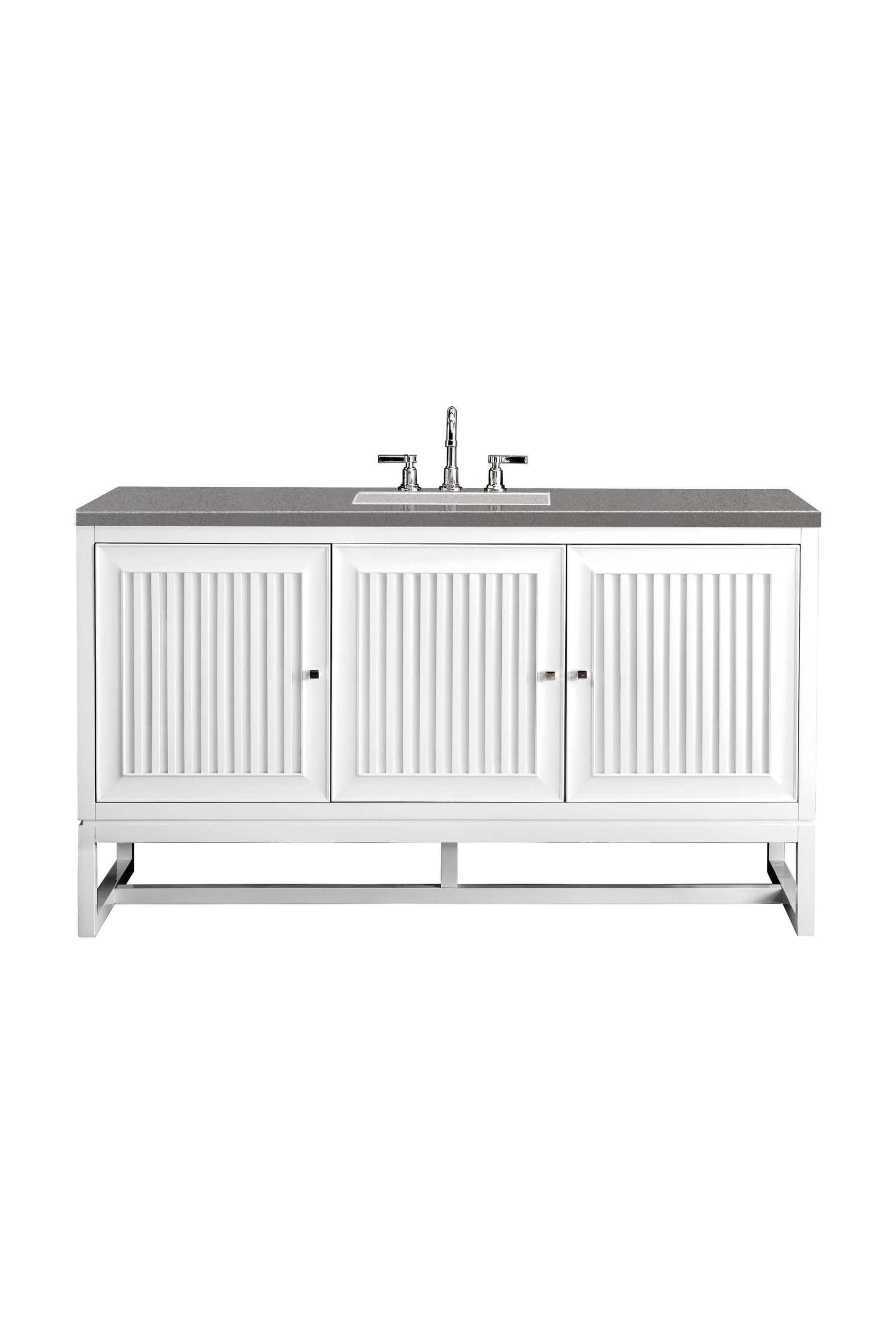 Bring a bit of the Greek Island home with the Athens 60” Glossy White Single Vanity by James Martin Vanities. Part of the larger Athens modular collection, this incredible Vanity boasts an impressive amount of storage space and combines traditional charm with modern functionality. Premium standard features include soft-close undermount drawer glides and adjustable door hinges, brushed aluminium laminate drawer bottoms, and one bamboo drawer organizer. The look is completed with a 3 CM eased edge Grey Expo Silestone top and one white ceramic rectangular sink.