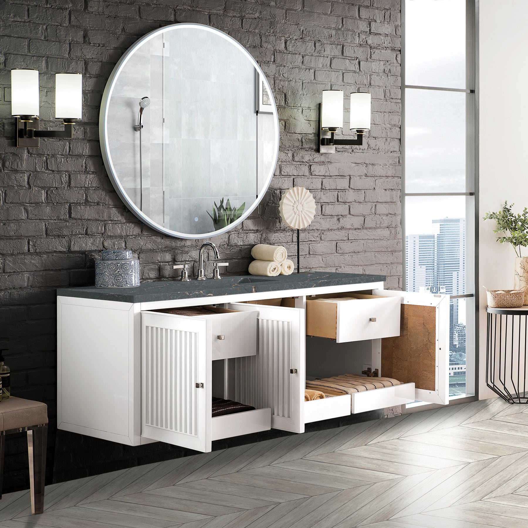 Customize your space with the Athens 60” Glossy White Single Vanity by James Martin Vanities. Part of the larger Athens modular collection, this incredible Vanity boasts an impressive amount of storage space and combines traditional charm with modern functionality. Premium standard features include soft-close undermount drawer glides and adjustable door hinges, brushed aluminum laminate drawer bottoms, and one bamboo drawer organizer. The Bright White finish is enhanced by the Parisien Bleu Silestone top, offering a deep bluish hue with broad and intricate neutral veins highlighted by fine coppery accents.