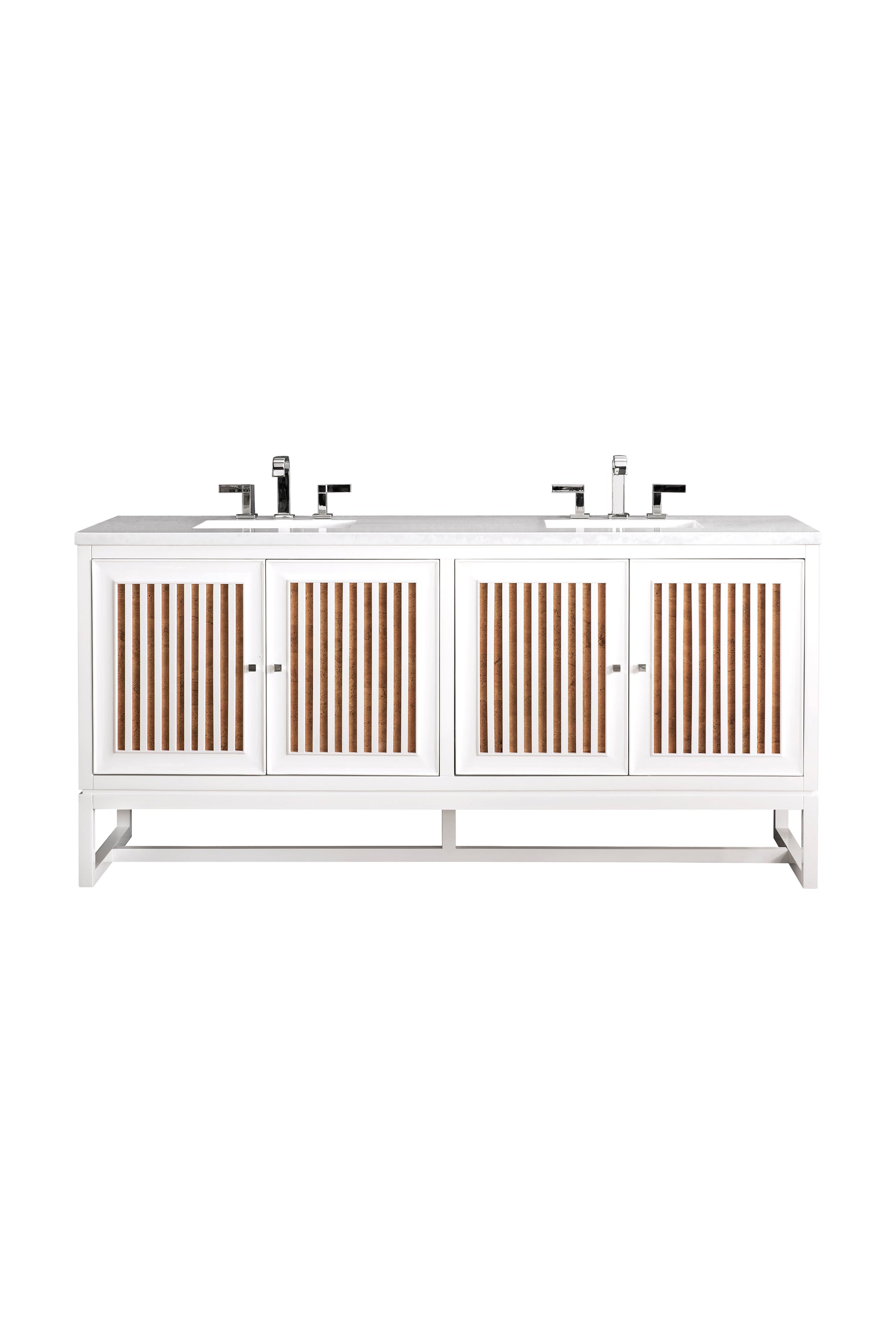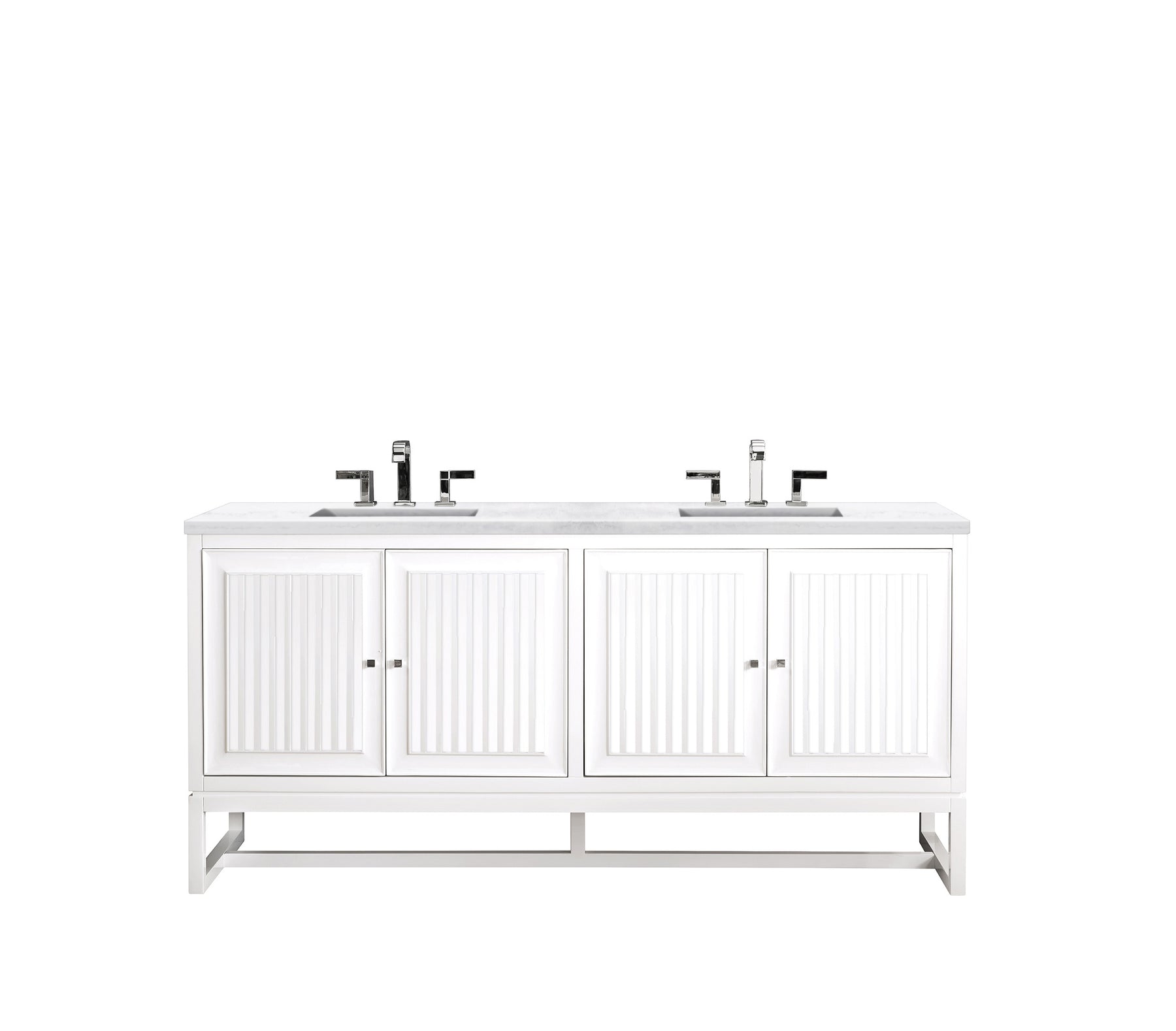 Bring a bit of the Greek Island home with the Athens 72” Glossy White Double Vanity by James Martin Vanities. Part of the larger Athens modular collection, this incredible Vanity boasts an impressive amount of storage space and combines traditional charm with modern functionality. Premium standard features include soft-close undermount drawer glides and adjustable door hinges, brushed aluminium laminate drawer bottoms, and one bamboo drawer organizer. The look is completed with a 3 CM eased edge Arctic Fall Solid Surface top and two white ceramic rectangular sinks.