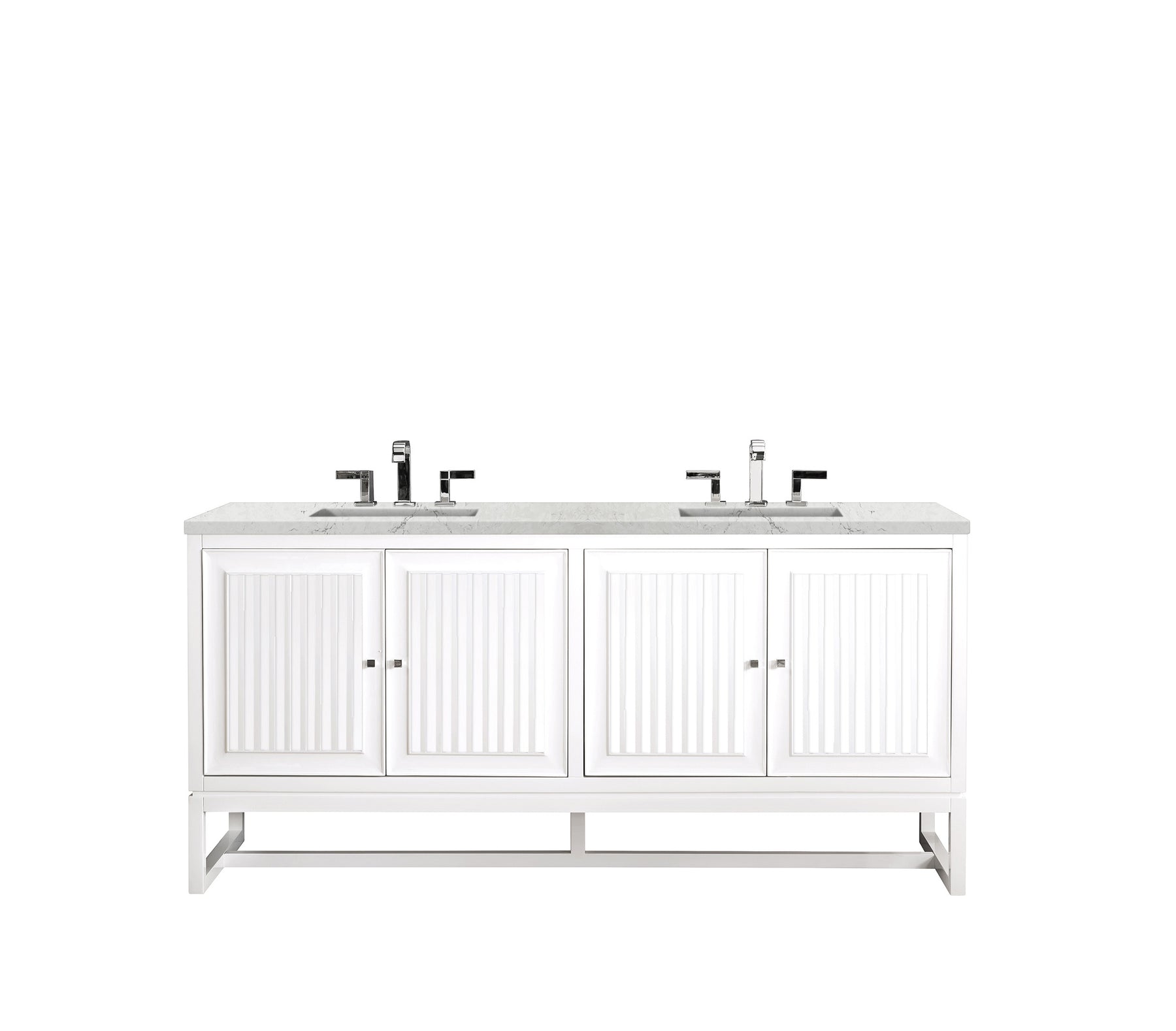 Bring a bit of the Greek Island home with the Athens 72” Glossy White Double Vanity by James Martin Vanities. Part of the larger Athens modular collection, this incredible Vanity boasts an impressive amount of storage space and combines traditional charm with modern functionality. Premium standard features include soft-close undermount drawer glides and adjustable door hinges, brushed aluminium laminate drawer bottoms, and one bamboo drawer organizer. The look is completed with a 3 CM eased edge Eternal Marfil Silestone top and two white ceramic rectangular sinks.