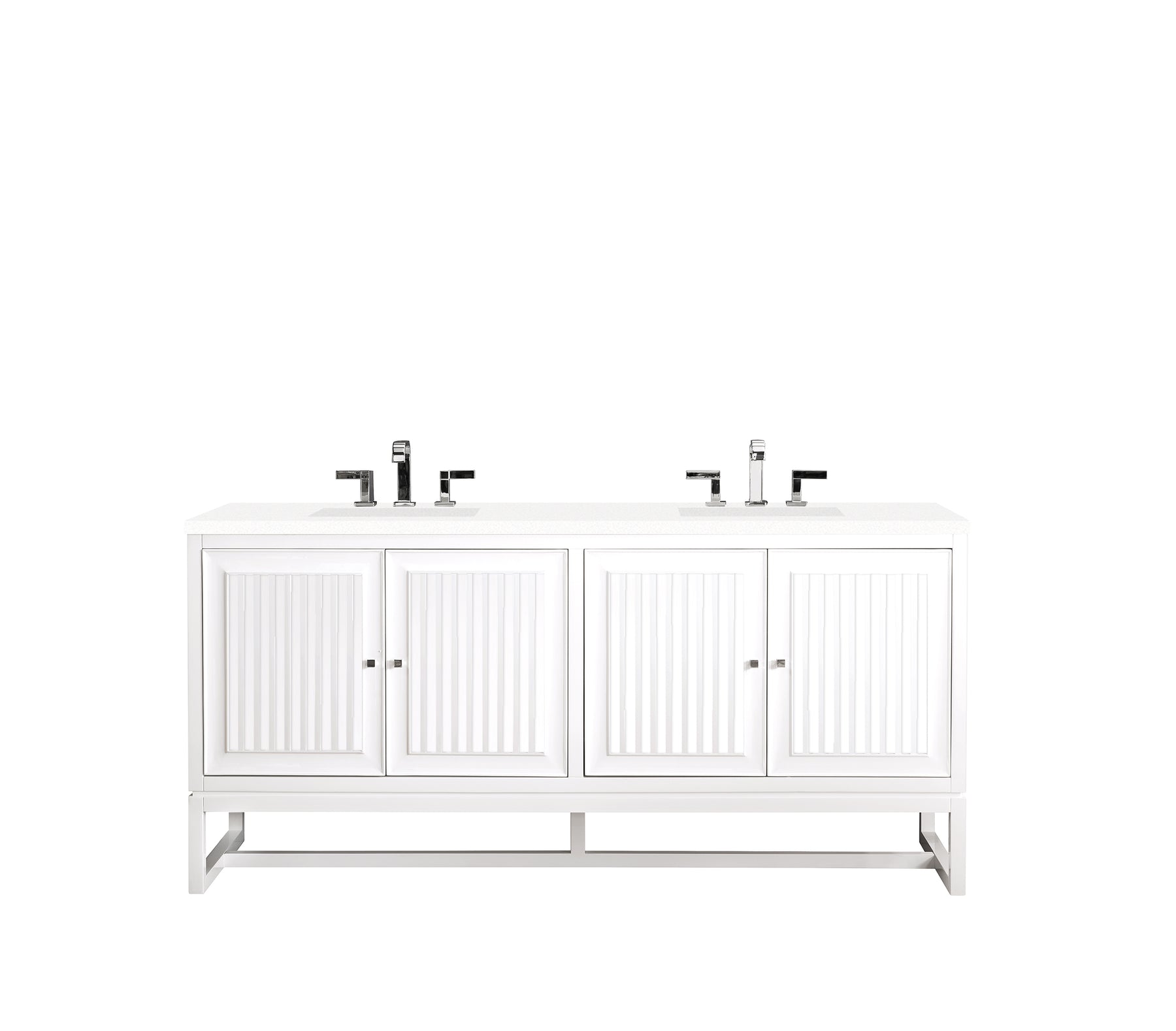 Bring a bit of the Greek Island home with the Athens 72” Glossy White Double Vanity by James Martin Vanities. Part of the larger Athens modular collection, this incredible Vanity boasts an impressive amount of storage space and combines traditional charm with modern functionality. Premium standard features include soft-close undermount drawer glides and adjustable door hinges, brushed aluminium laminate drawer bottoms, and one bamboo drawer organizer. The look is completed with a 3 CM eased edge White Zeus Silestone top and two white ceramic rectangular sinks.