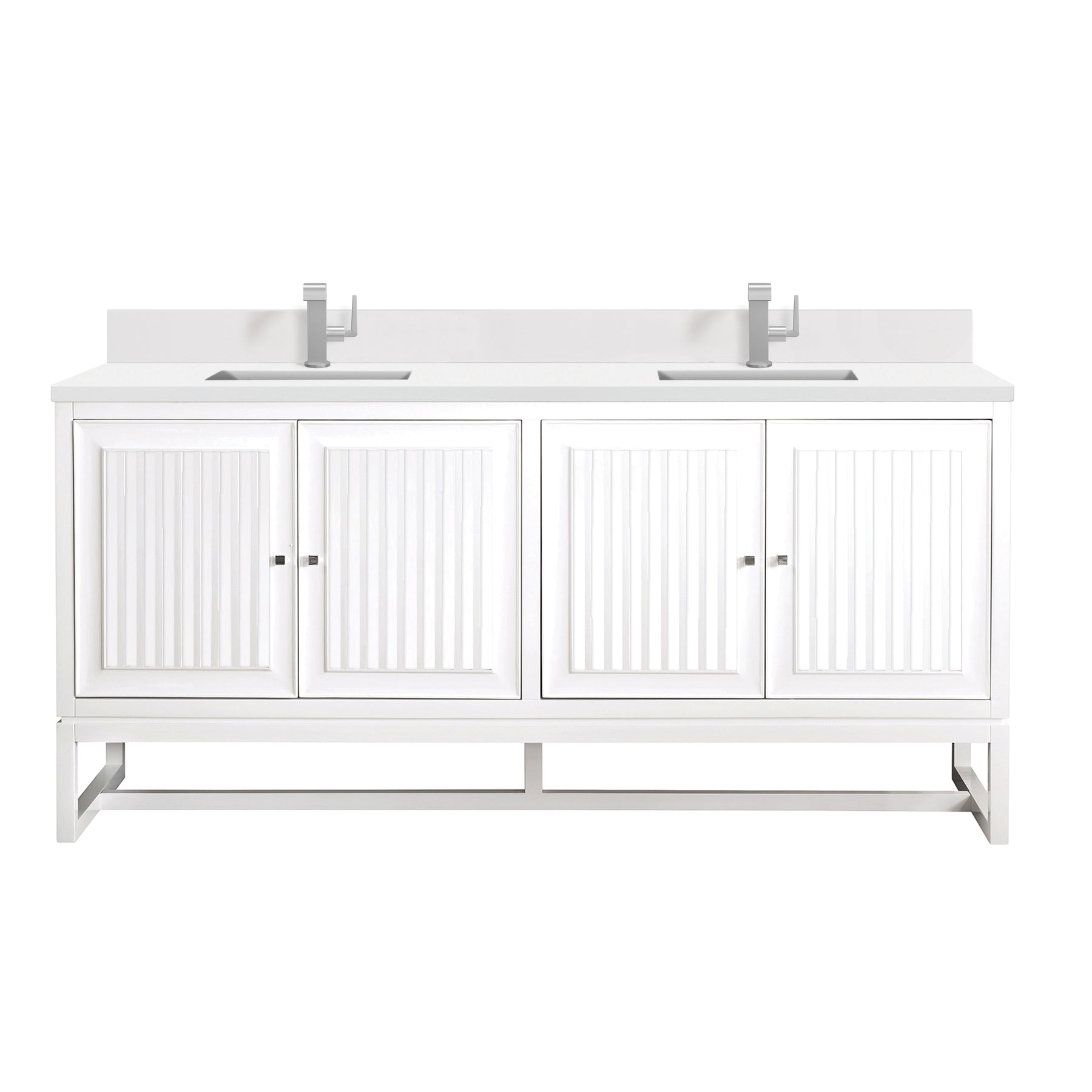 Customize your space with the Athens 72” Glossy White Double Vanity by James Martin Vanities. Part of the larger Athens modular collection, this incredible Vanity boasts an impressive amount of storage space and combines traditional charm with modern functionality. Premium standard features include soft-close undermount drawer glides and adjustable door hinges, brushed aluminum laminate drawer bottoms, and one bamboo drawer organizer. The timeless, White Zeus Silestone top and backsplash provides a contemporary touch.