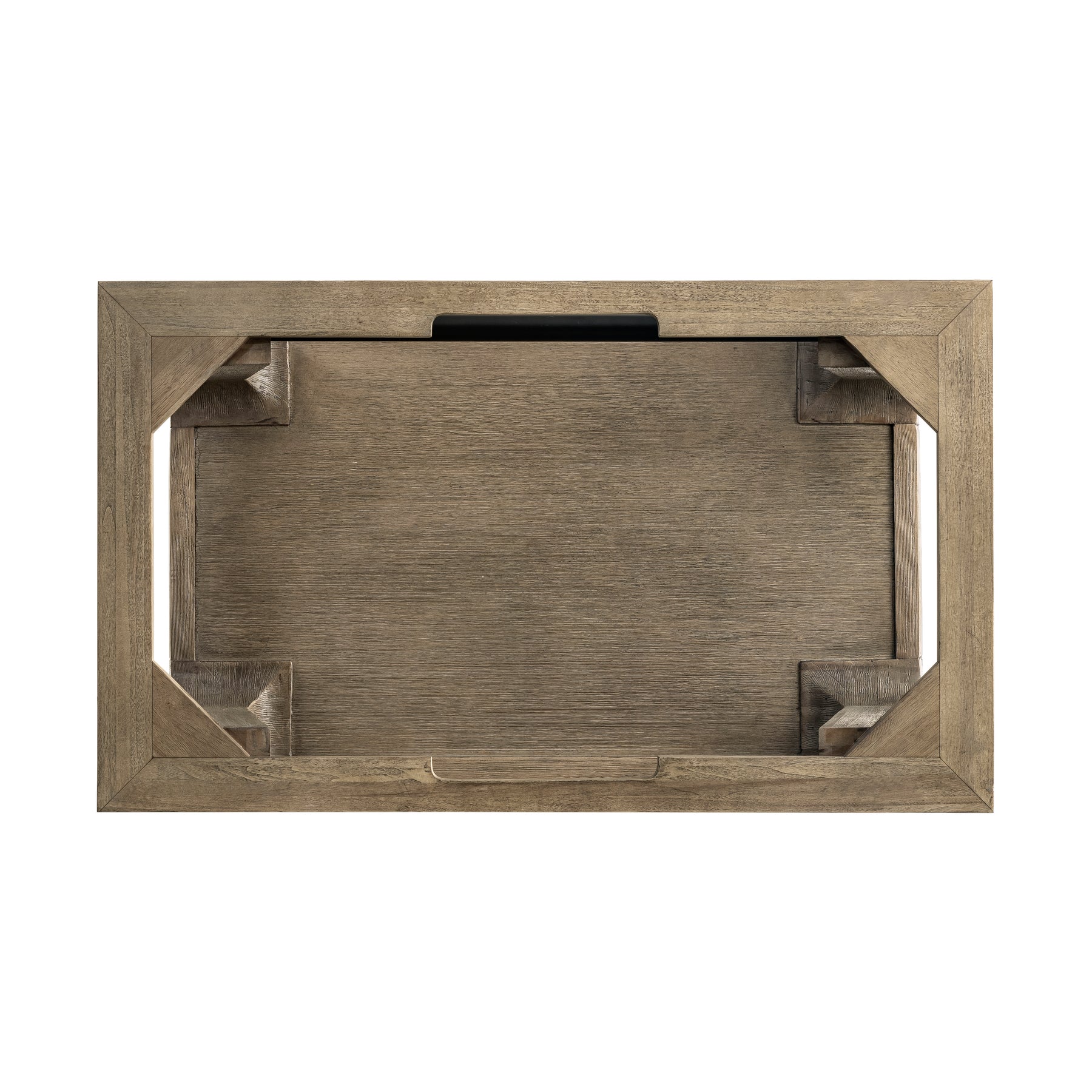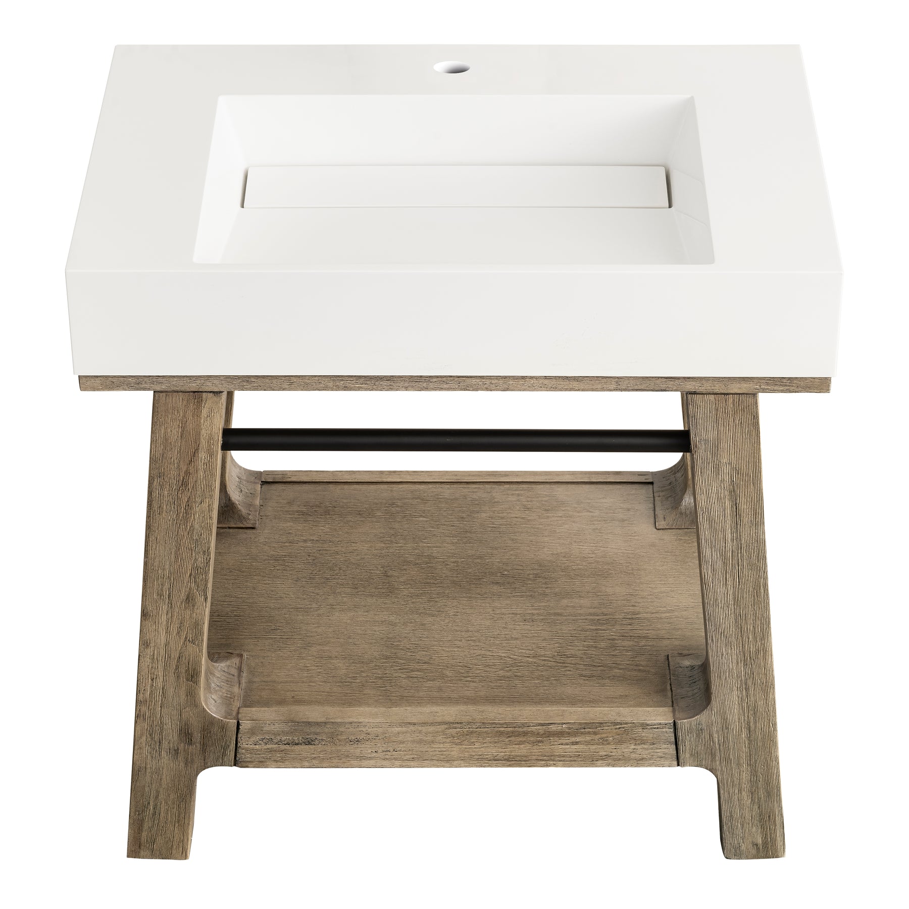 A blend of rustic and Scandinavian design, the 31.5" Auburn console vanity has a modern shape that features rugged yet elegant details. The wire-brushed finish showcases natural texture and wood grains with subtle distressing. The integrated Matte Black towel bar and shelf serve as functional and decorative storage for towels and bath accessories.