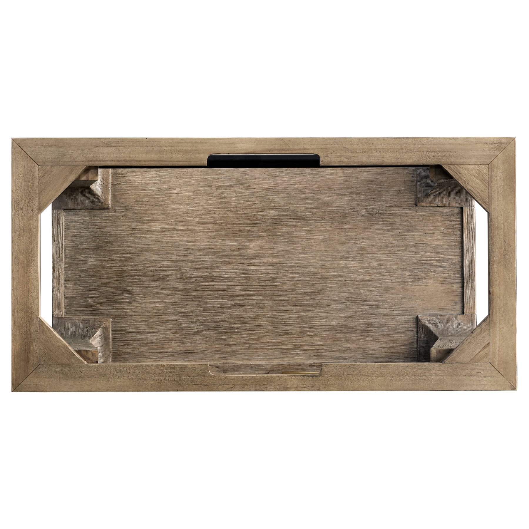 A blend of rustic and Scandinavian design, the 36" Auburn console vanity has a modern shape that features rugged yet elegant details. The wire-brushed finish showcases natural texture and wood grains with subtle distressing. The integrated Matte Black towel bar and shelf serve as functional and decorative storage for towels and bath accessories.