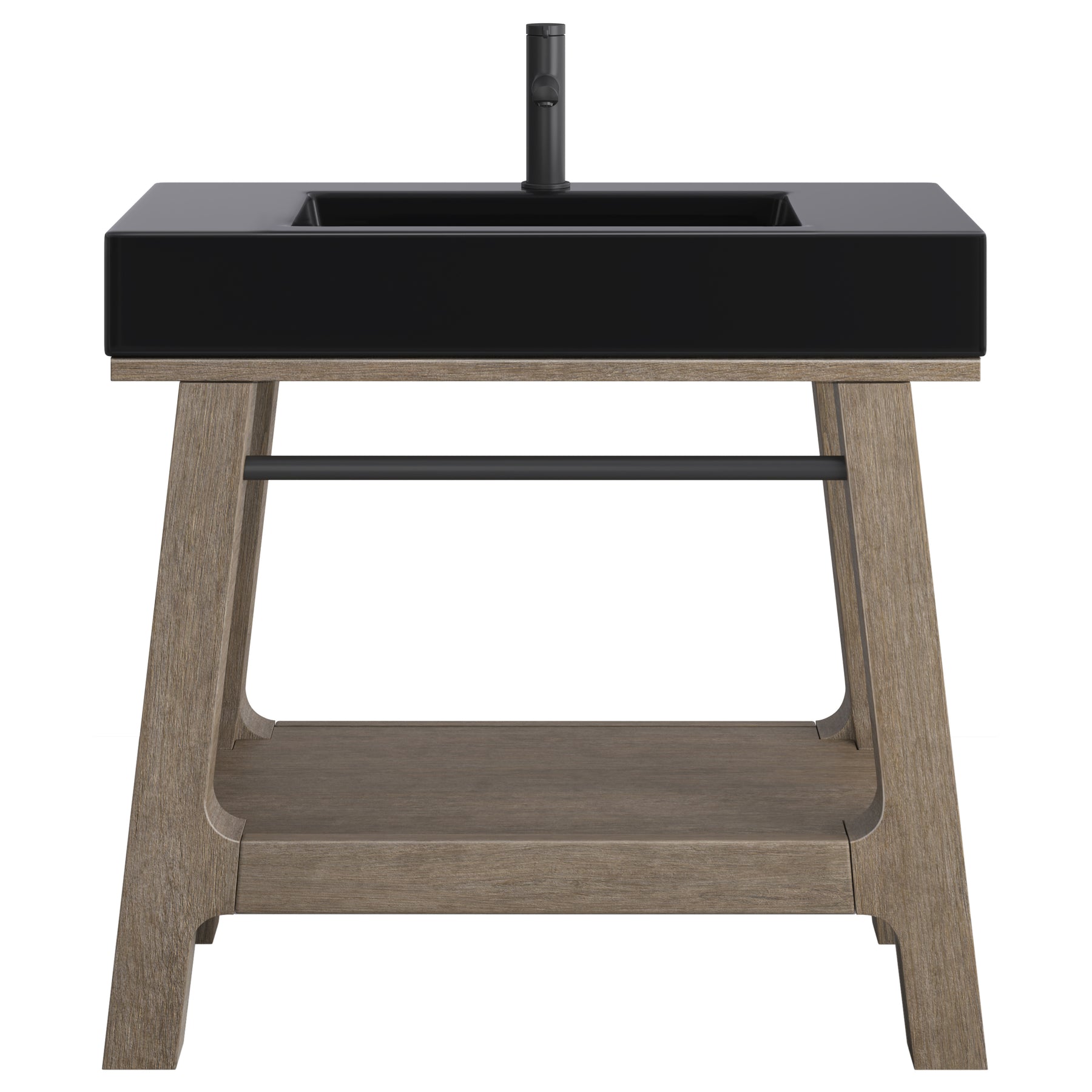 A blend of rustic and Scandinavian design, the 36" Auburn console vanity has a modern shape that features rugged yet elegant details. The wire-brushed finish showcases natural texture and wood grains with subtle distressing. The smooth, high-profile integrated Composite Stone sink top in Black Matte adds an unexpected modern texture. The integrated Matte Black towel bar and shelf serve as functional and decorative storage for towels and bath accessories.