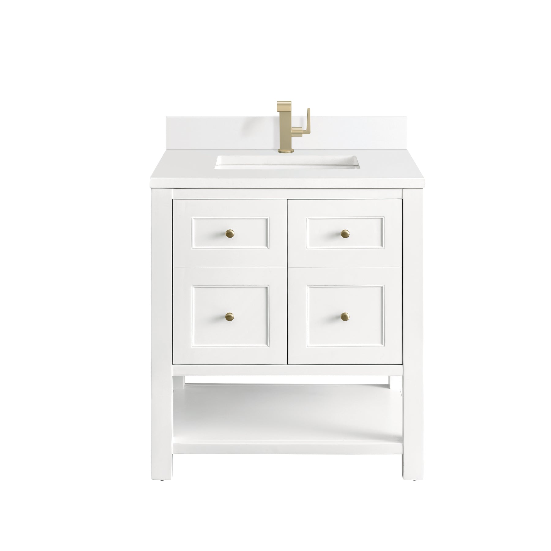 The Breckenridge 30" Single Vanity is a fresh take on traditional Mission furniture that easily transitions to Modern Farmhouse style with an air of understated sophistication. Champagne Brass knobs complement the Bright White finish, while the neatly inset door and drawer fronts lend a fresh appeal to this clean-lined classic. A two-door cabinet opens to reveal an interior shelf equipped with convenient built-in USB/120V power outlet. This console-style vanity also features an open lower shelf for additional storage. A single-hole faucet White Zeus Silestone top with undermount sink and backsplash complete the look with a contemporary touch.