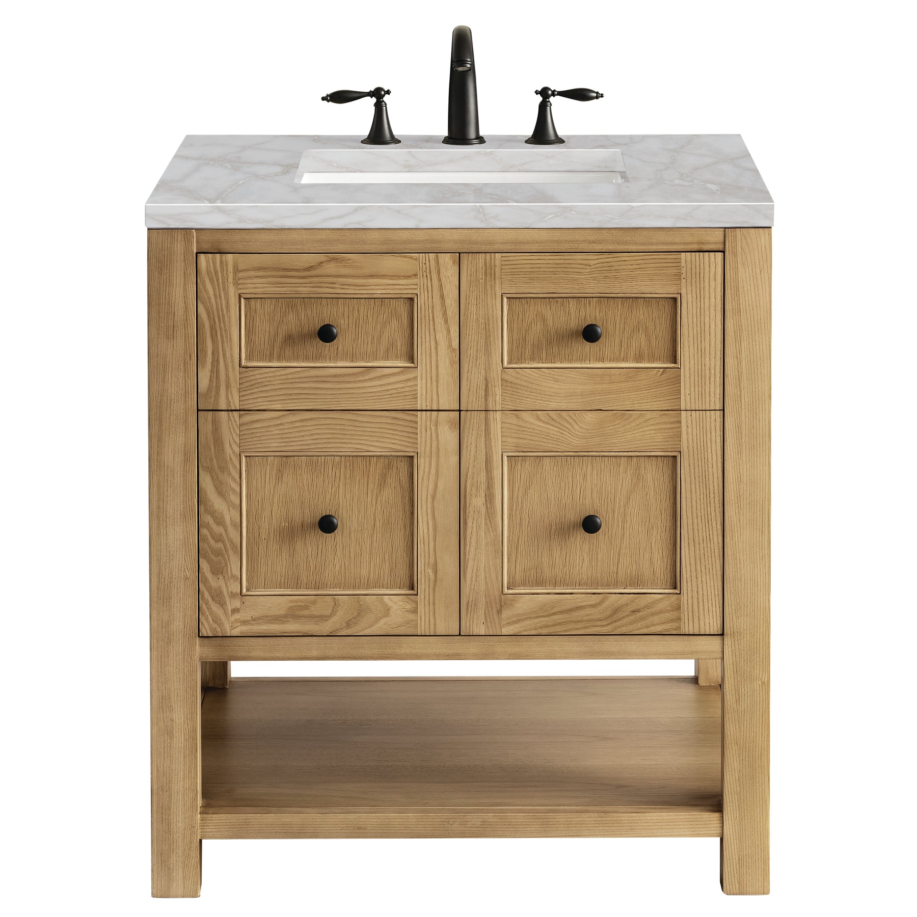 The Breckenridge 30" Single Vanity is a fresh take on traditional Mission furniture that easily transitions to Modern Farmhouse style with an air of understated sophistication. Matte Black knobs complement the Light Natural Oak finish, while the neatly inset door and drawer fronts lend a fresh appeal to this clean-lined classic. A two-door cabinet opens to reveal an interior shelf equipped with convenient built-in USB/120V power outlet. This console-style vanity also features an open lower shelf for additional storage. A beautiful Victorian Silver Silestone top with undermount sink completes the look.