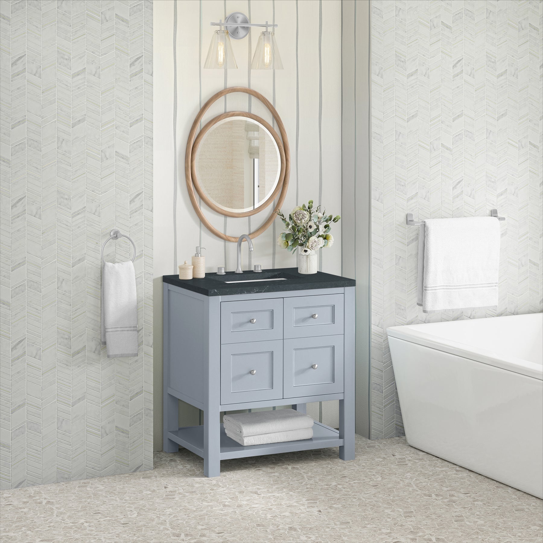The Breckenridge 30" Single Vanity is a fresh take on traditional Mission furniture that easily transitions to Modern Farmhouse style with an air of understated sophistication. Satin Nickel knobs complement the Serenity Blue finish, while the neatly inset door and drawer fronts lend a fresh appeal to this clean-lined classic. A two-door cabinet opens to reveal an interior shelf equipped with convenient built-in USB/120V power outlet. This console-style vanity also features an open lower shelf for additional storage. A suede-finished Charcoal Soapstone Silestone top with undermount sink completes the look.