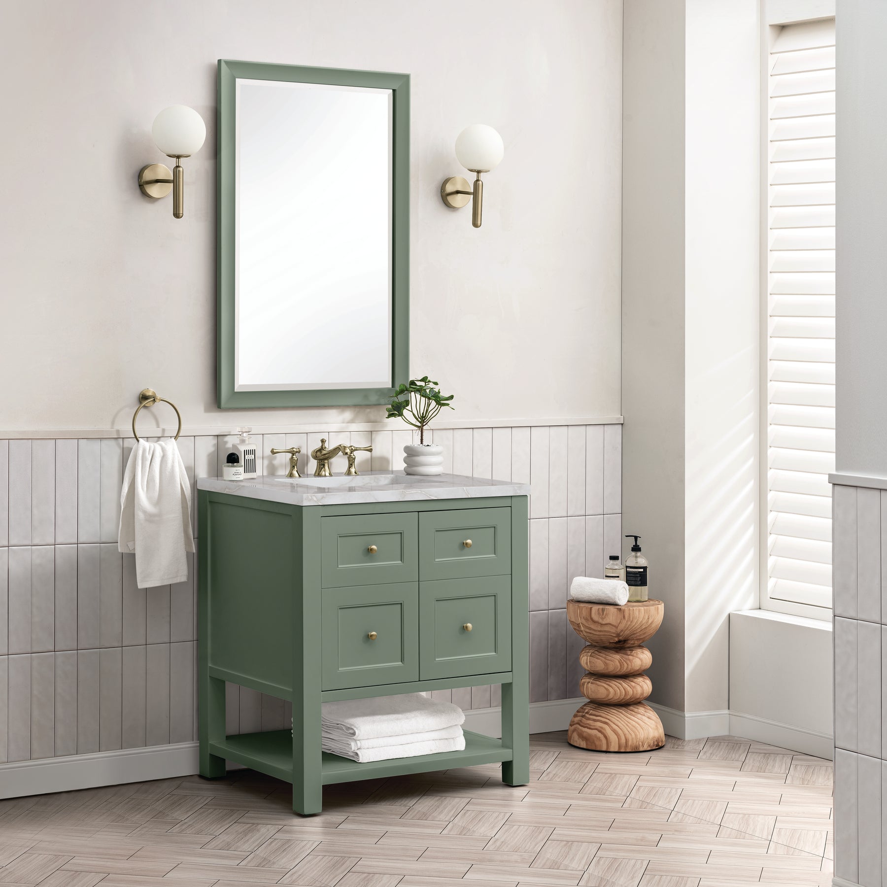 The Breckenridge 30" Single Vanity is a fresh take on traditional Mission furniture that easily transitions to Modern Farmhouse style with an air of understated sophistication. Champagne Brass knobs complement the Smokey Celadon finish, while the neatly inset door and drawer fronts lend a fresh appeal to this clean-lined classic. A two-door cabinet opens to reveal an interior shelf equipped with convenient built-in USB/120V power outlet. This console-style vanity also features an open lower shelf for additional storage. A beautiful Victorian Silver Silestone top with undermount sink completes the look.