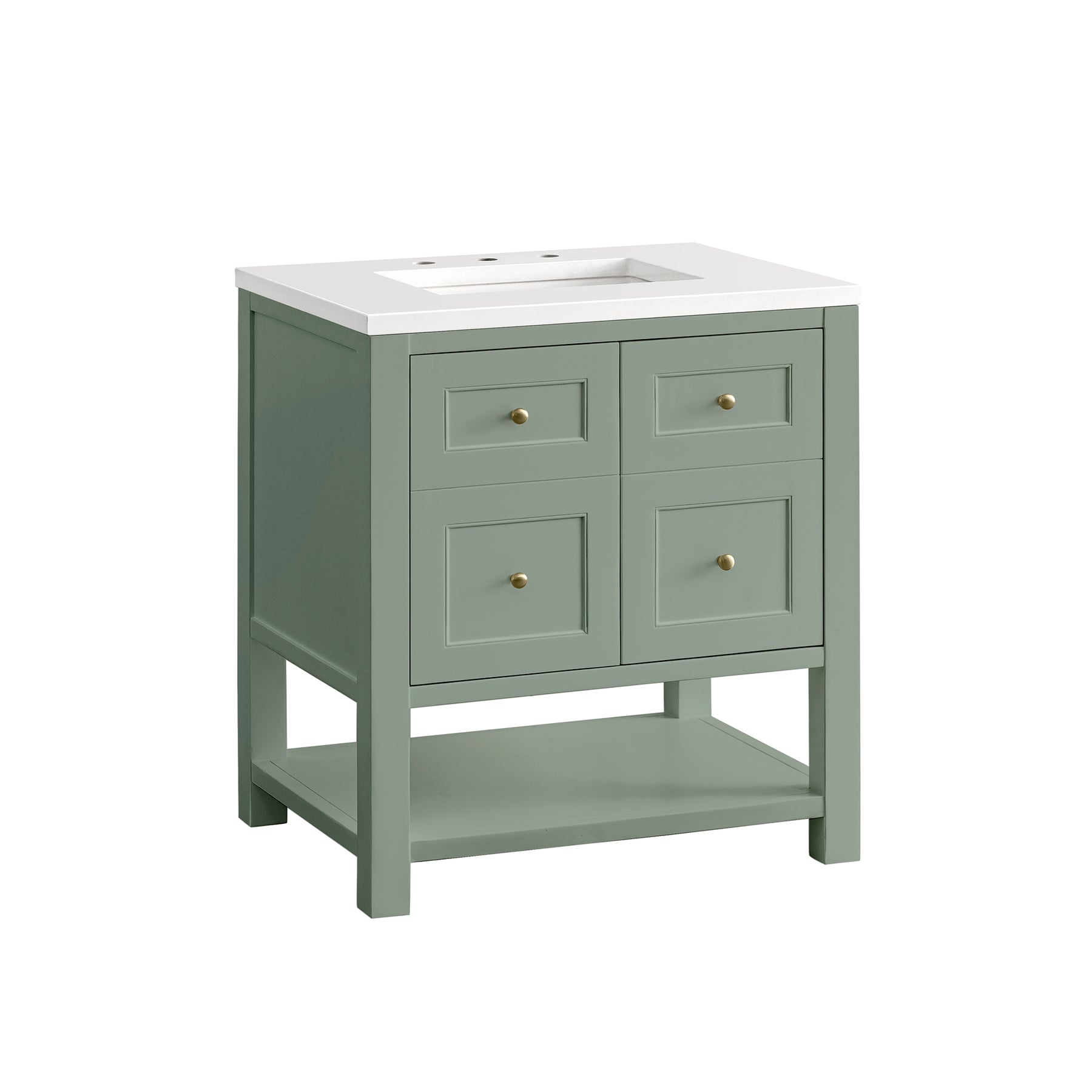 The Breckenridge 30" Single Vanity is a fresh take on traditional Mission furniture that easily transitions to Modern Farmhouse style with an air of understated sophistication. Champagne Brass knobs complement the Smokey Celadon finish, while the neatly inset door and drawer fronts lend a fresh appeal to this clean-lined classic. A two-door cabinet opens to reveal an interior shelf equipped with convenient built-in USB/120V power outlet. This console-style vanity also features an open lower shelf for additional storage. A classic White Zeus Silestone top with undermount sink completes the look.