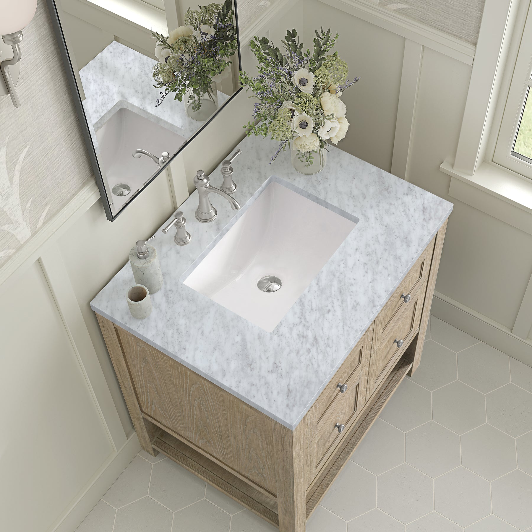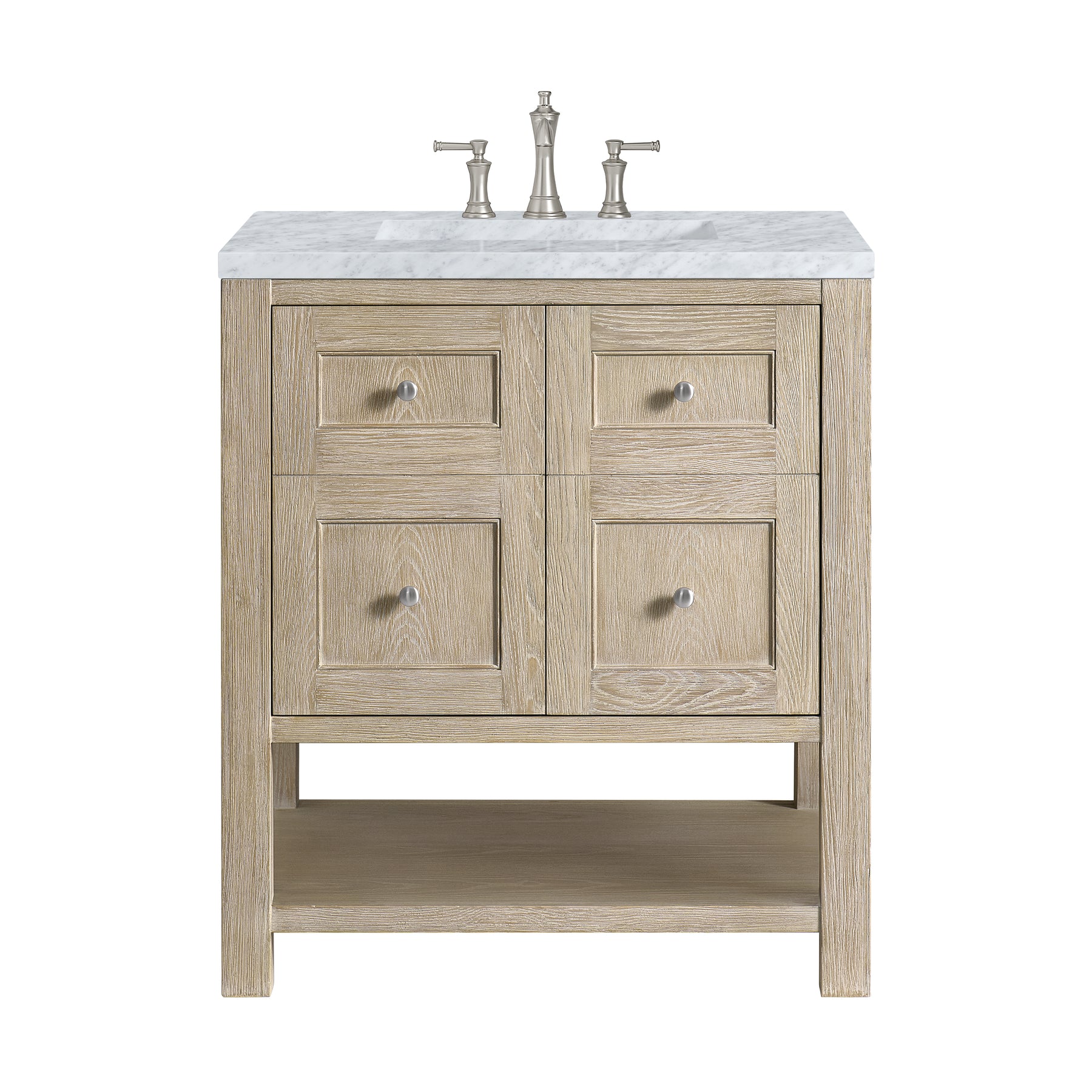 The Breckenridge 30" Single Vanity is a fresh take on traditional Mission furniture that easily transitions to Modern Farmhouse style with an air of understated sophistication. Satin Nickel knobs complement the Whitewashed Oak finish, while the neatly inset door and drawer fronts lend a fresh appeal to this clean-lined classic. A two-door cabinet opens to reveal an interior shelf equipped with convenient built-in USB/120V power outlet. This console-style vanity also features an open lower shelf for additional storage. A classic Carrara Marble top with undermount sink completes the look.