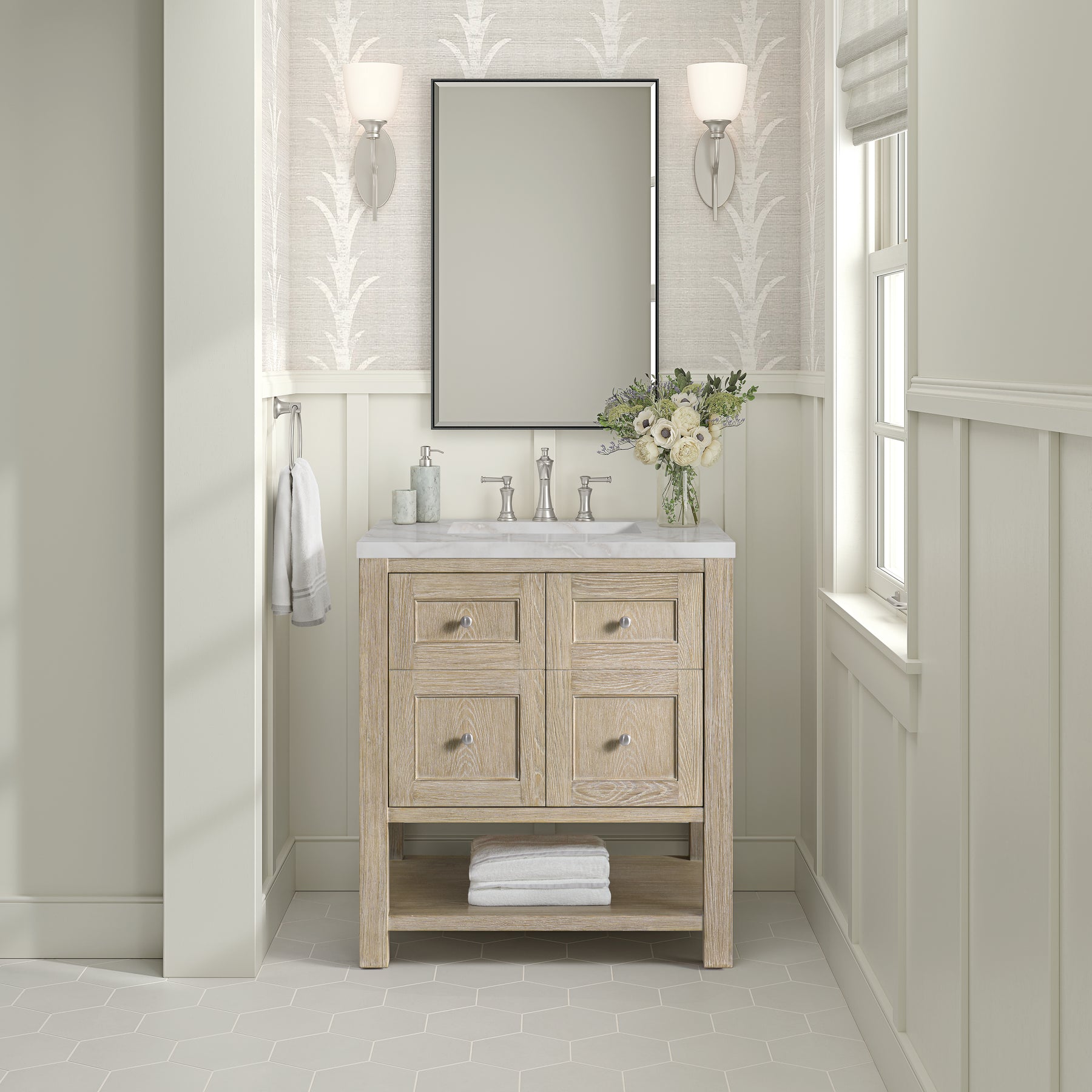 The Breckenridge 30" Single Vanity is a fresh take on traditional Mission furniture that easily transitions to Modern Farmhouse style with an air of understated sophistication. Satin Nickel knobs complement the Whitewashed Oak finish, while the neatly inset door and drawer fronts lend a fresh appeal to this clean-lined classic. A two-door cabinet opens to reveal an interior shelf equipped with convenient built-in USB/120V power outlet. This console-style vanity also features an open lower shelf for additional storage. A beautiful Victorian Silver Silestone top with undermount sink completes the look.