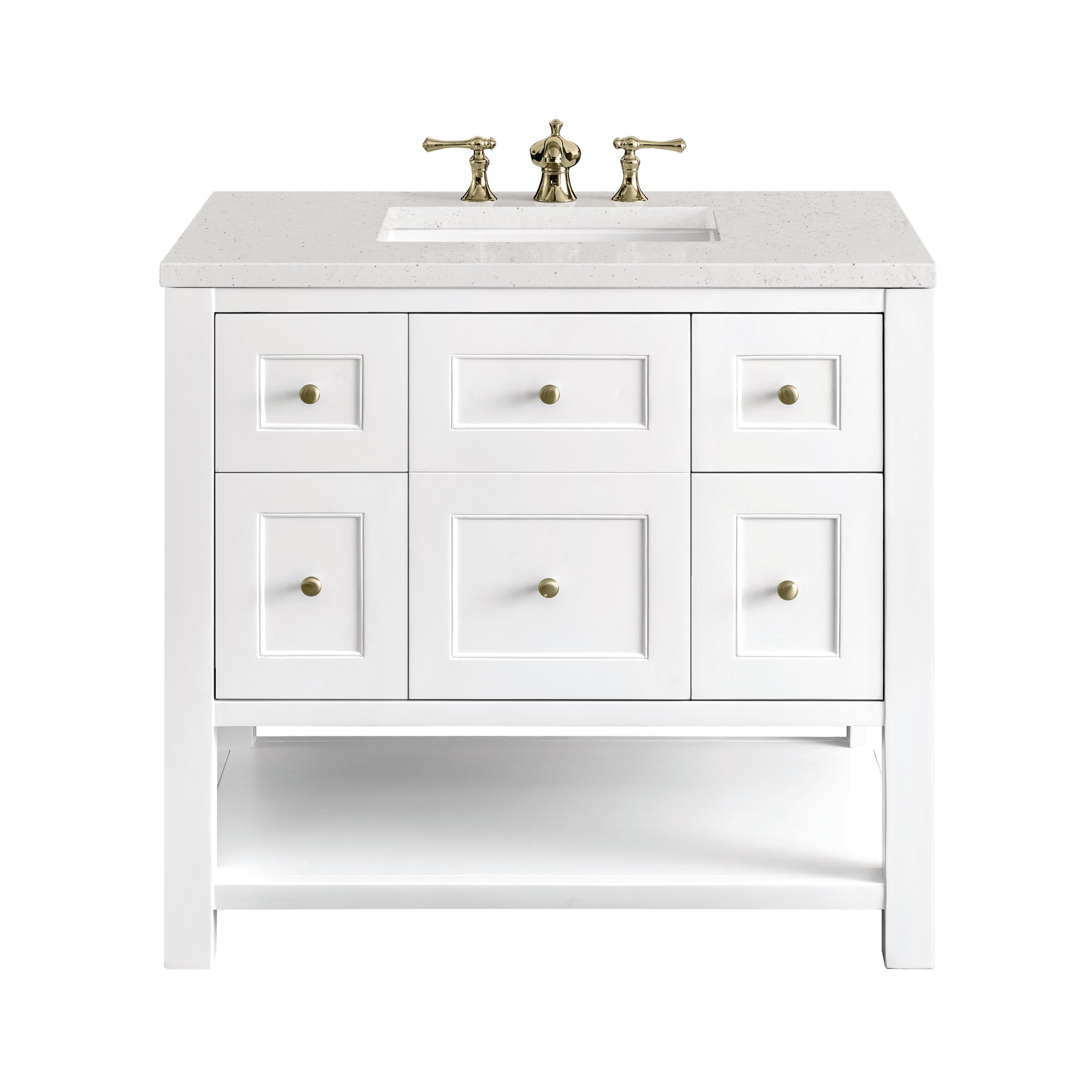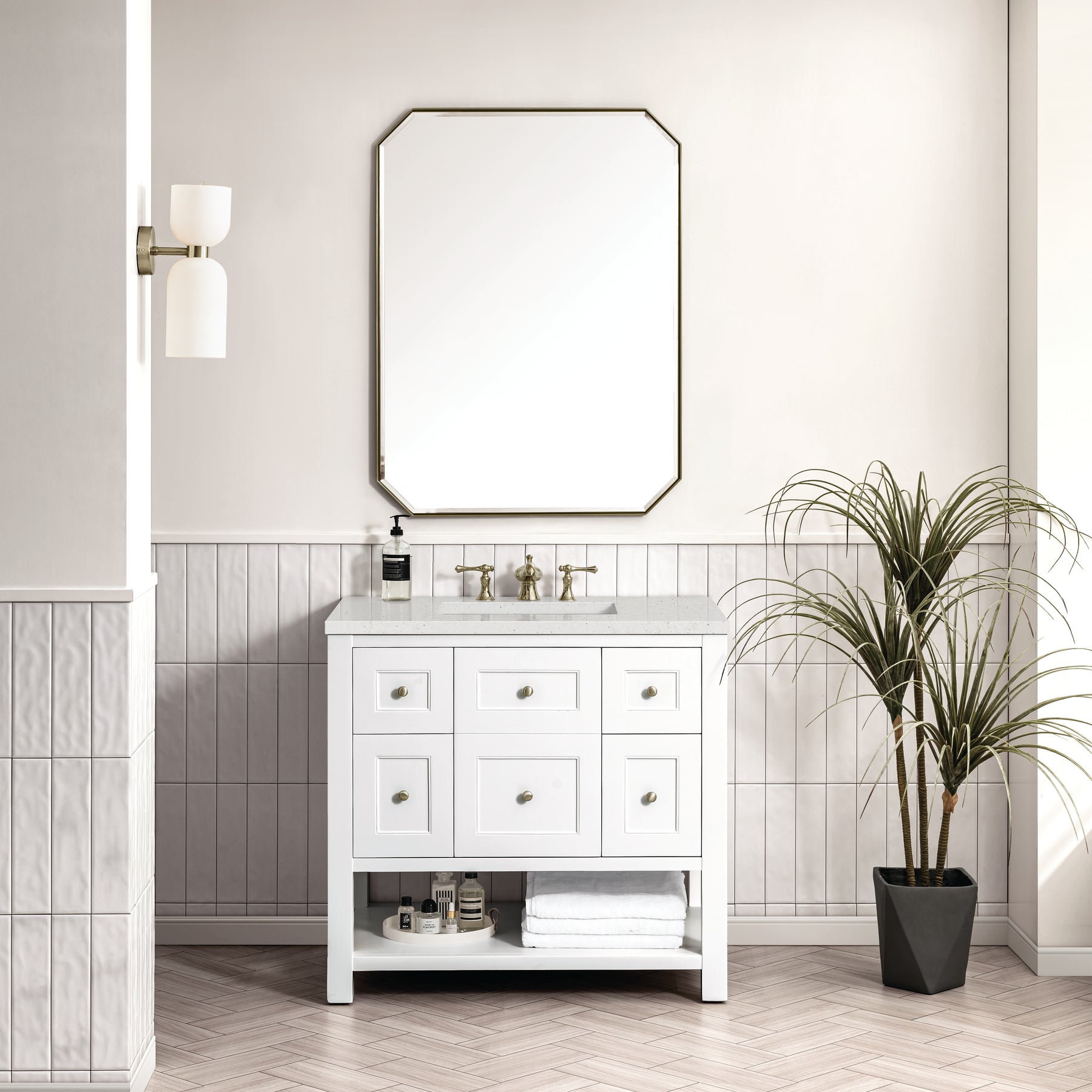 The Breckenridge 36" Single Vanity is a fresh take on traditional Mission furniture that easily transitions to Modern Farmhouse style with an air of understated sophistication. Champagne Brass knobs complement the Bright White finish, while the neatly inset door and drawer fronts lend a fresh appeal to this clean-lined classic. A single-door cabinet opens to reveal an interior shelf equipped with convenient built-in USB/120V power outlet. This console-style vanity also features two top-row tip-out drawers, two standard full-extension drawers, and an open lower shelf for additional storage. A suede-finished Lime Delight Silestone top with undermount sink completes the look.