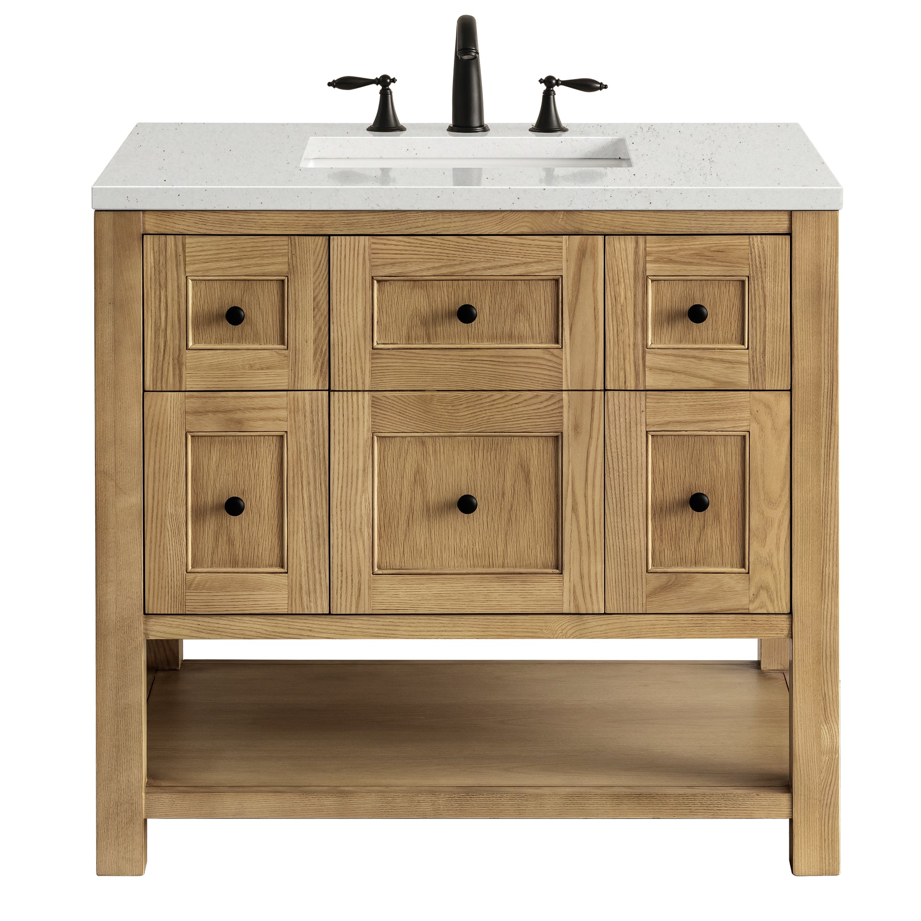 The Breckenridge 36" Single Vanity is a fresh take on traditional Mission furniture that easily transitions to Modern Farmhouse style with an air of understated sophistication. Matte Black knobs complement the Light Natural Oak finish, while the neatly inset door and drawer fronts lend a fresh appeal to this clean-lined classic. A single-door cabinet opens to reveal an interior shelf equipped with convenient built-in USB/120V power outlet. This console-style vanity also features two top-row tip-out drawers, two standard full-extension drawers, and an open lower shelf for additional storage. A suede-finished Lime Delight Silestone top with undermount sink completes the look.