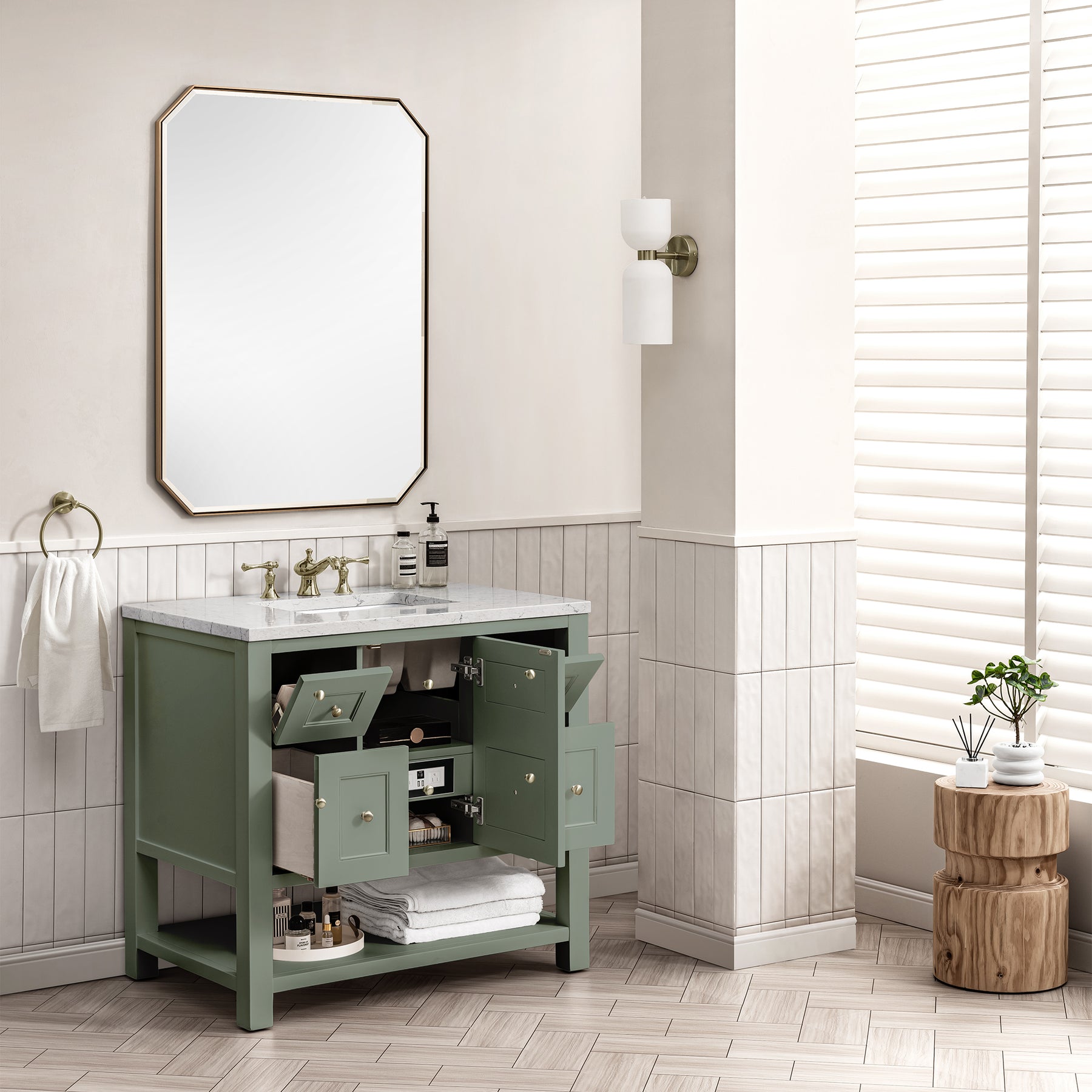 The Breckenridge 36" Single Vanity is a fresh take on traditional Mission furniture that easily transitions to Modern Farmhouse style with an air of understated sophistication. Champagne Brass knobs complement the Smokey Celadon finish, while the neatly inset door and drawer fronts lend a fresh appeal to this clean-lined classic. A single-door cabinet opens to reveal an interior shelf equipped with convenient built-in USB/120V power outlet. This console-style vanity also features two top-row tip-out drawers, two standard full-extension drawers, and an open lower shelf for additional storage. A modern Arctic Fall Solid Surface top with undermount sink completes the look.