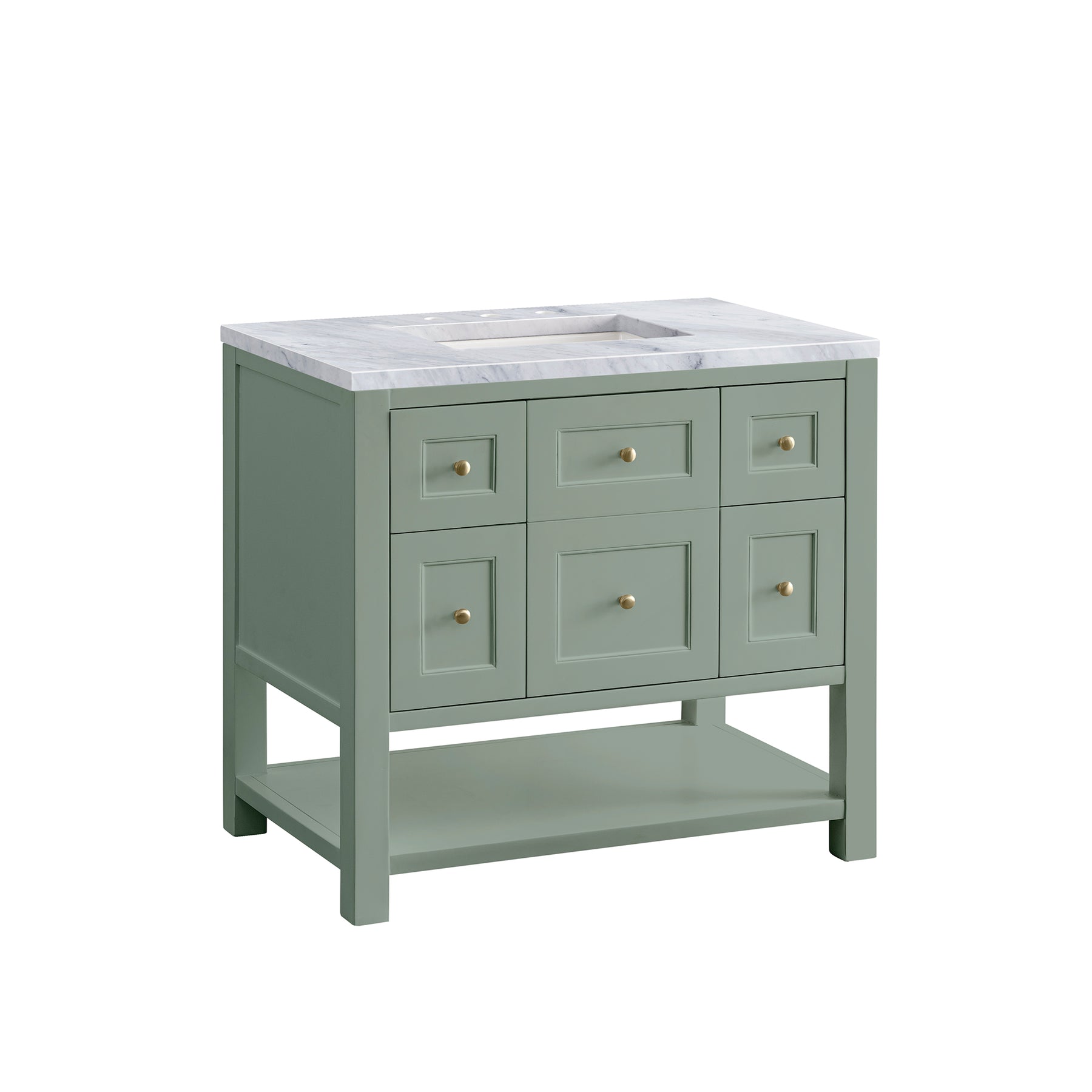 The Breckenridge 36" Single Vanity is a fresh take on traditional Mission furniture that easily transitions to Modern Farmhouse style with an air of understated sophistication. Champagne Brass knobs complement the Smokey Celadon finish, while the neatly inset door and drawer fronts lend a fresh appeal to this clean-lined classic. A single-door cabinet opens to reveal an interior shelf equipped with convenient built-in USB/120V power outlet. This console-style vanity also features two top-row tip-out drawers, two standard full-extension drawers, and an open lower shelf for additional storage. A classic Carrara Marble top with undermount sink completes the look.