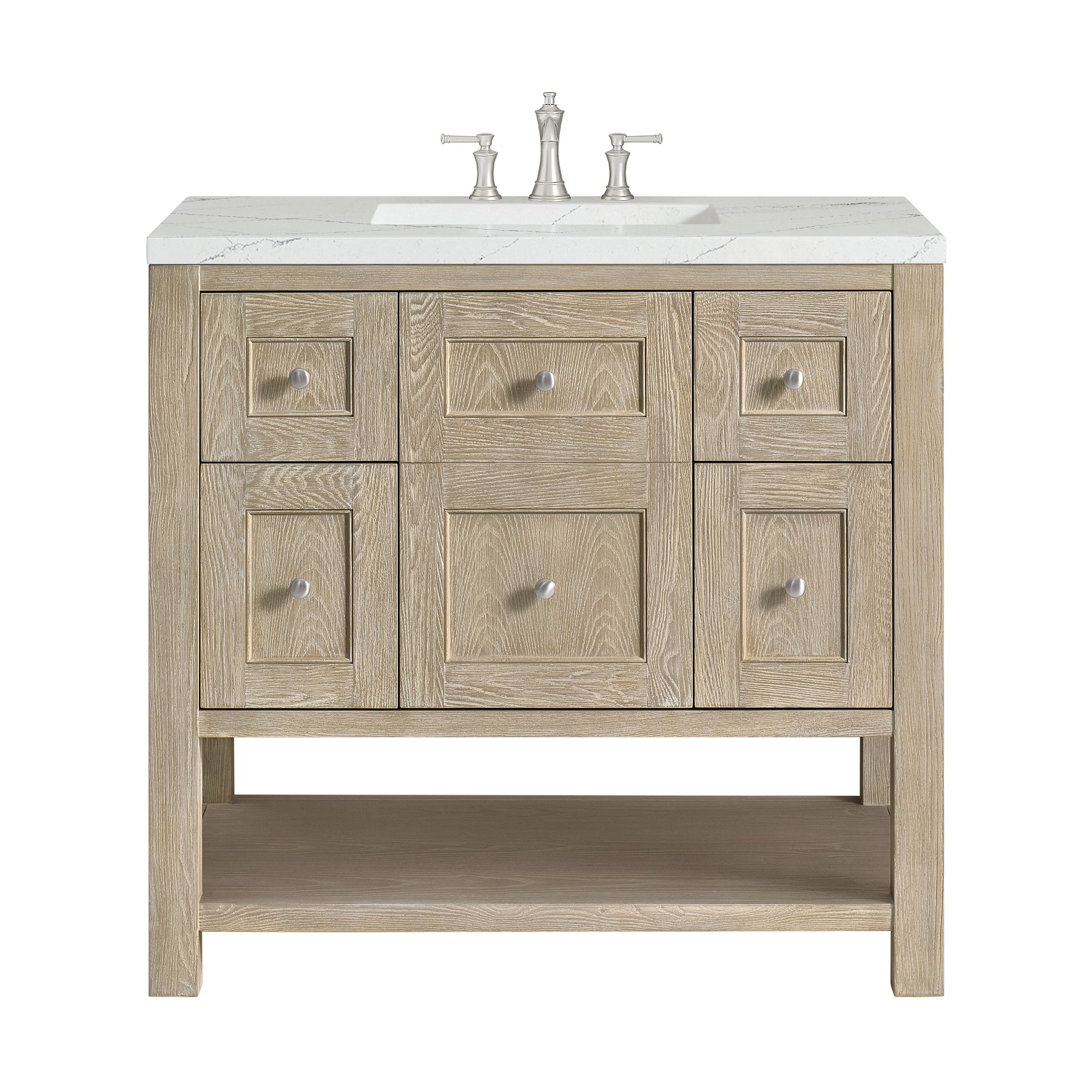 The Breckenridge 36" Single Vanity is a fresh take on traditional Mission furniture that easily transitions to Modern Farmhouse style with an air of understated sophistication. Satin Nickel knobs complement the Whitewashed Oak finish, while the neatly inset door and drawer fronts lend a fresh appeal to this clean-lined classic. A single-door cabinet opens to reveal an interior shelf equipped with convenient built-in USB/120V power outlet. This console-style vanity also features two top-row tip-out drawers, two standard full-extension drawers, and an open lower shelf for additional storage. A stunning Ethereal Noctis Silestone top with undermount sink completes the look.