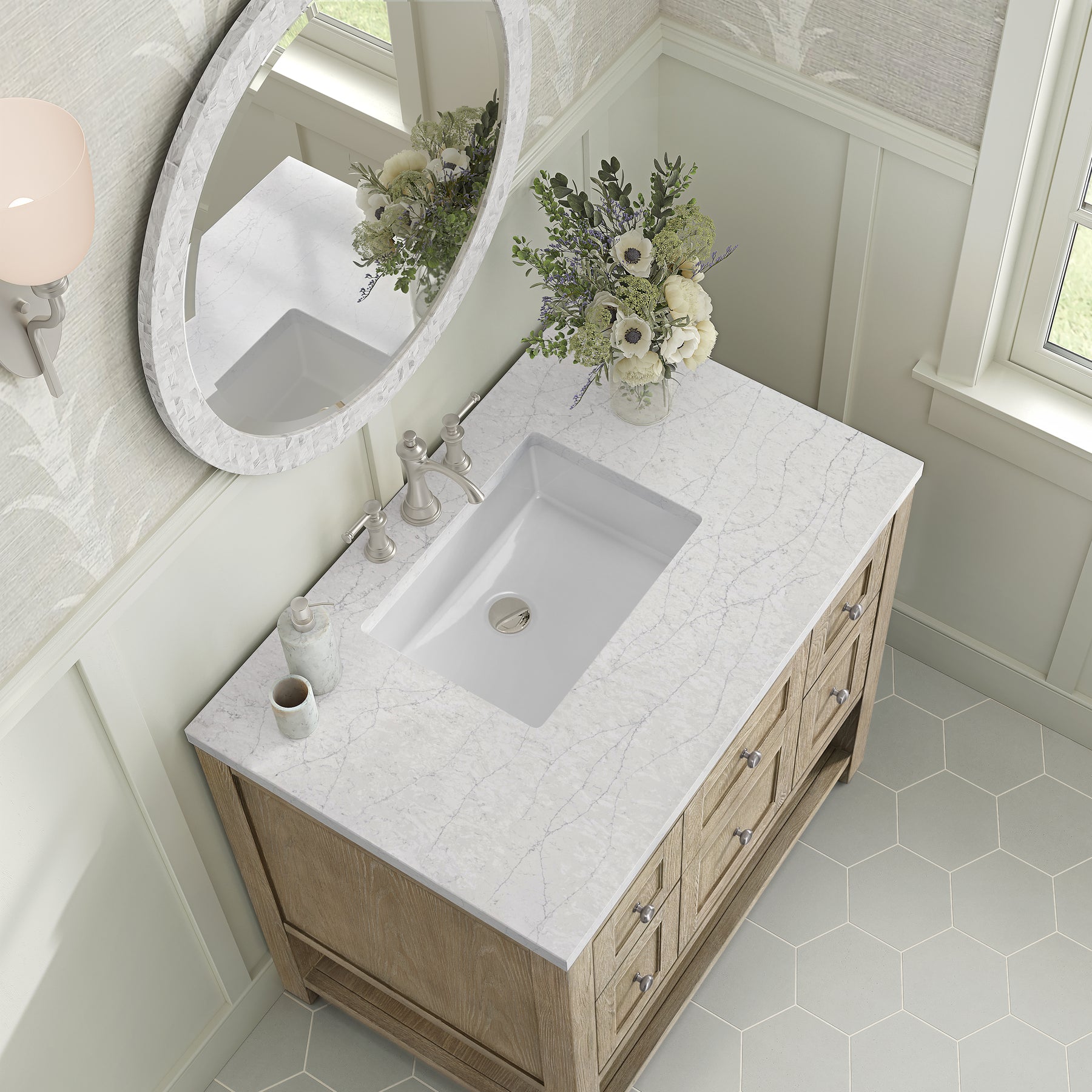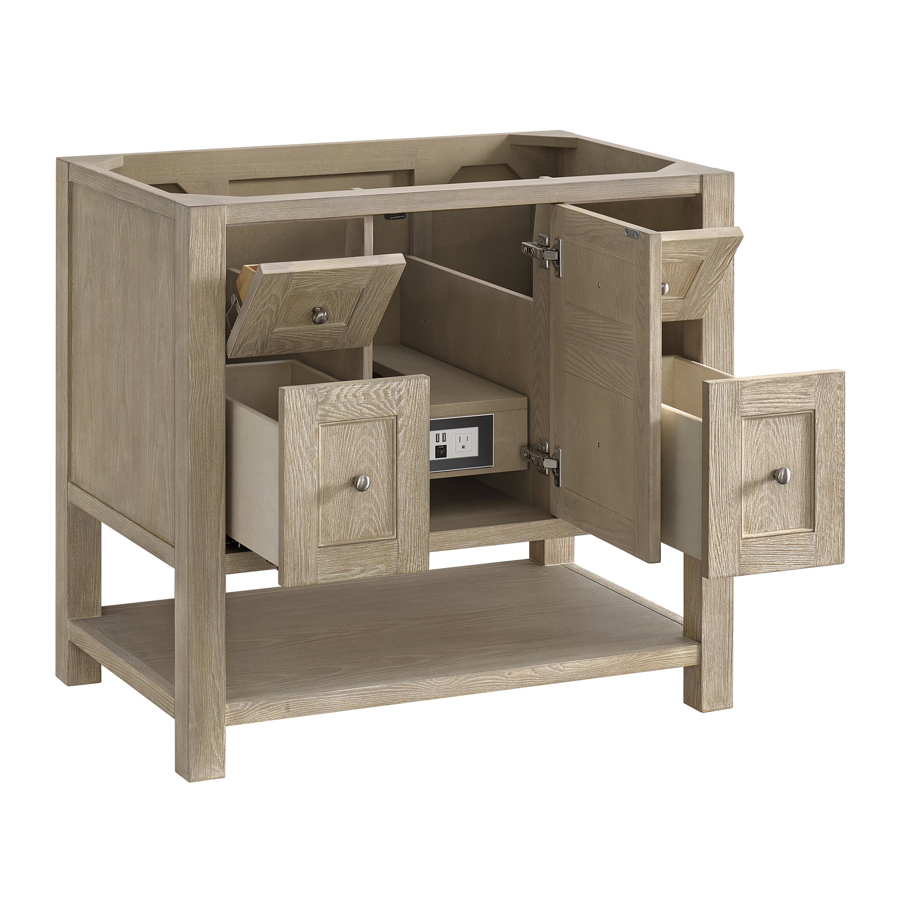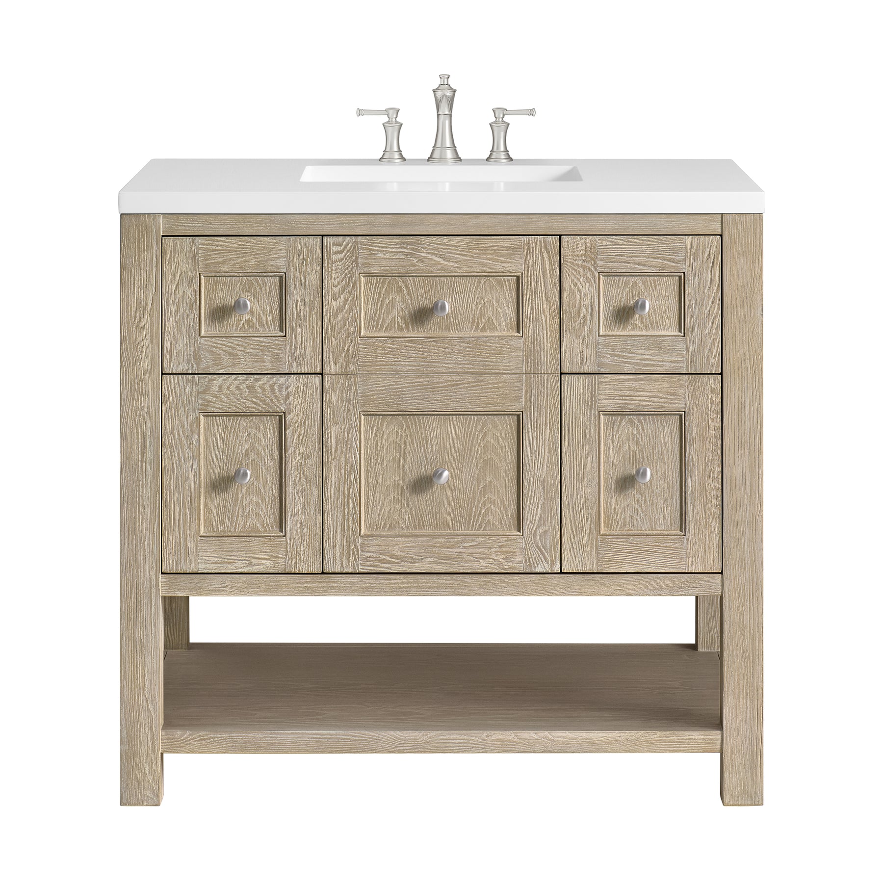 The Breckenridge 36" Single Vanity is a fresh take on traditional Mission furniture that easily transitions to Modern Farmhouse style with an air of understated sophistication. Satin Nickel knobs complement the Whitewashed Oak finish, while the neatly inset door and drawer fronts lend a fresh appeal to this clean-lined classic. A single-door cabinet opens to reveal an interior shelf equipped with convenient built-in USB/120V power outlet. This console-style vanity also features two top-row tip-out drawers, two standard full-extension drawers, and an open lower shelf for additional storage. A classic White Zeus Silestone top with undermount sink completes the look.