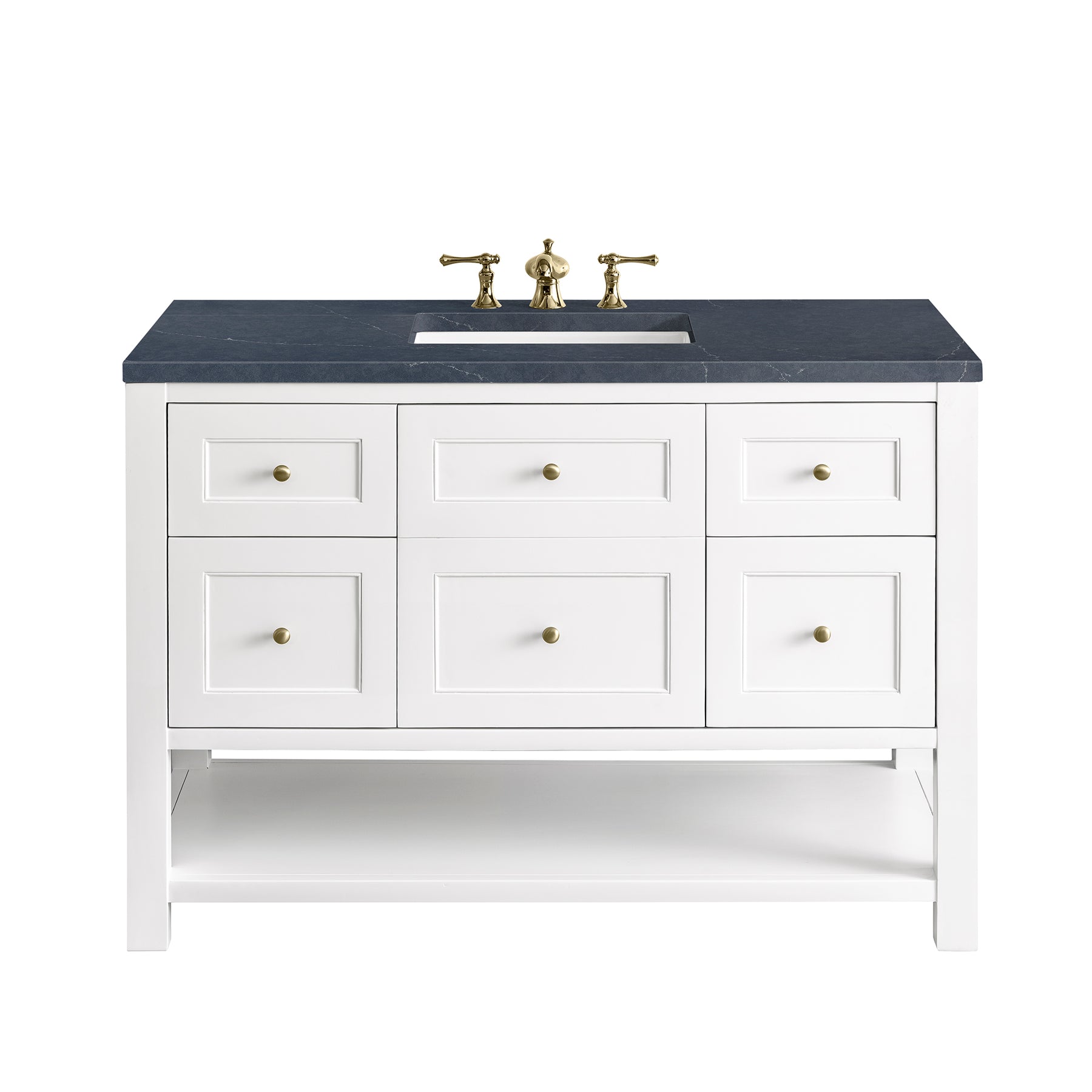 The Breckenridge 48" Single Vanity is a fresh take on traditional Mission furniture that easily transitions to Modern Farmhouse style with an air of understated sophistication. Champagne Brass knobs complement the Bright White finish, while the neatly inset door and drawer fronts lend a fresh appeal to this clean-lined classic. A single-door cabinet opens to reveal an interior shelf equipped with convenient built-in USB/120V power outlet. This console-style vanity also features four full-extension drawers and an open lower shelf for additional storage. A suede-finished Charcoal Soapstone Silestone top with undermount sink completes the look.