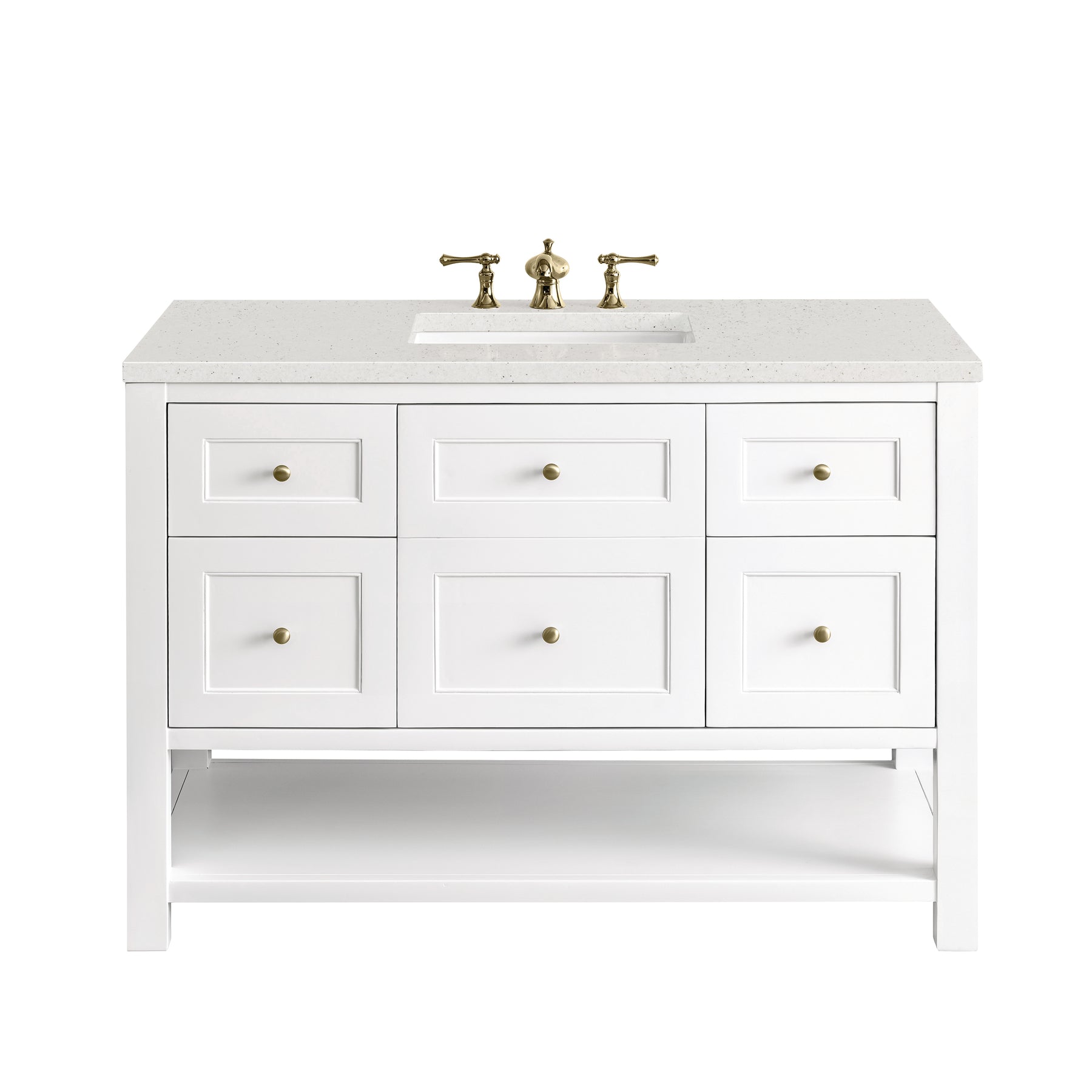 The Breckenridge 48" Single Vanity is a fresh take on traditional Mission furniture that easily transitions to Modern Farmhouse style with an air of understated sophistication. Champagne Brass knobs complement the Bright White finish, while the neatly inset door and drawer fronts lend a fresh appeal to this clean-lined classic. A single-door cabinet opens to reveal an interior shelf equipped with convenient built-in USB/120V power outlet. This console-style vanity also features four full-extension drawers and an open lower shelf for additional storage. A suede-finished Lime Delight Silestone top with undermount sink completes the look.