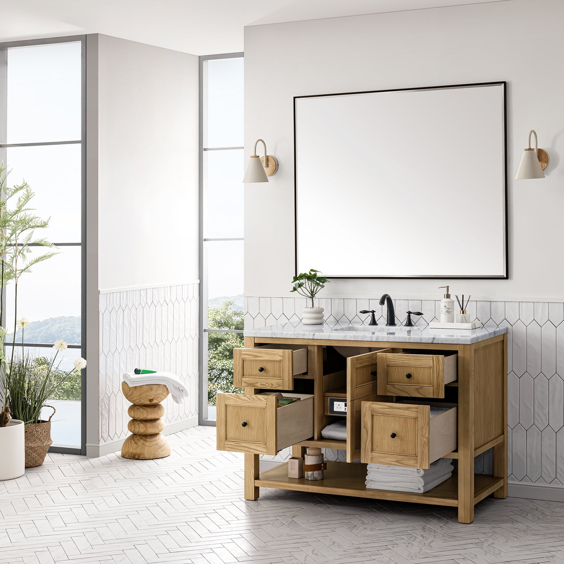 The Breckenridge 48" Single Vanity is a fresh take on traditional Mission furniture that easily transitions to Modern Farmhouse style with an air of understated sophistication. Matte Black knobs complement the Light Natural Oak finish, while the neatly inset door and drawer fronts lend a fresh appeal to this clean-lined classic. A single-door cabinet opens to reveal an interior shelf equipped with convenient built-in USB/120V power outlet. This console-style vanity also features four full-extension drawers and an open lower shelf for additional storage. A classic Carrara Marble top with undermount sink completes the look.