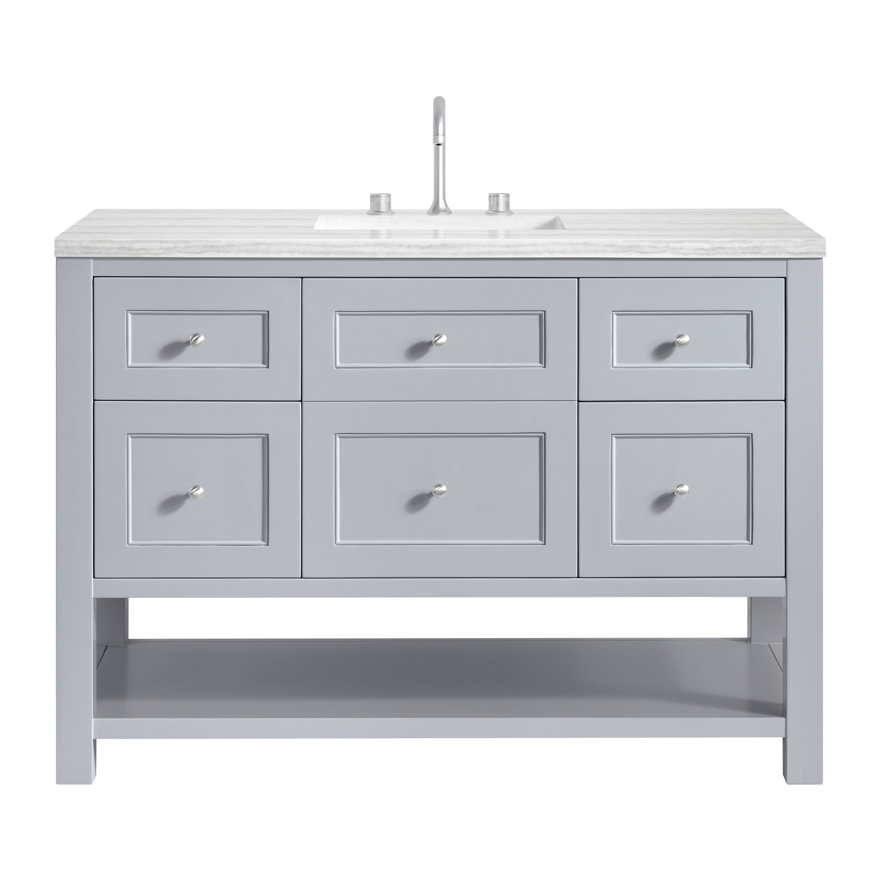 The Breckenridge 48" Single Vanity is a fresh take on traditional Mission furniture that easily transitions to Modern Farmhouse style with an air of understated sophistication. Satin Nickel knobs complement the Serenity Blue finish, while the neatly inset door and drawer fronts lend a fresh appeal to this clean-lined classic. A single-door cabinet opens to reveal an interior shelf equipped with convenient built-in USB/120V power outlet. This console-style vanity also features four full-extension drawers and an open lower shelf for additional storage. A modern Arctic Fall Solid Surface top with undermount sink completes the look.