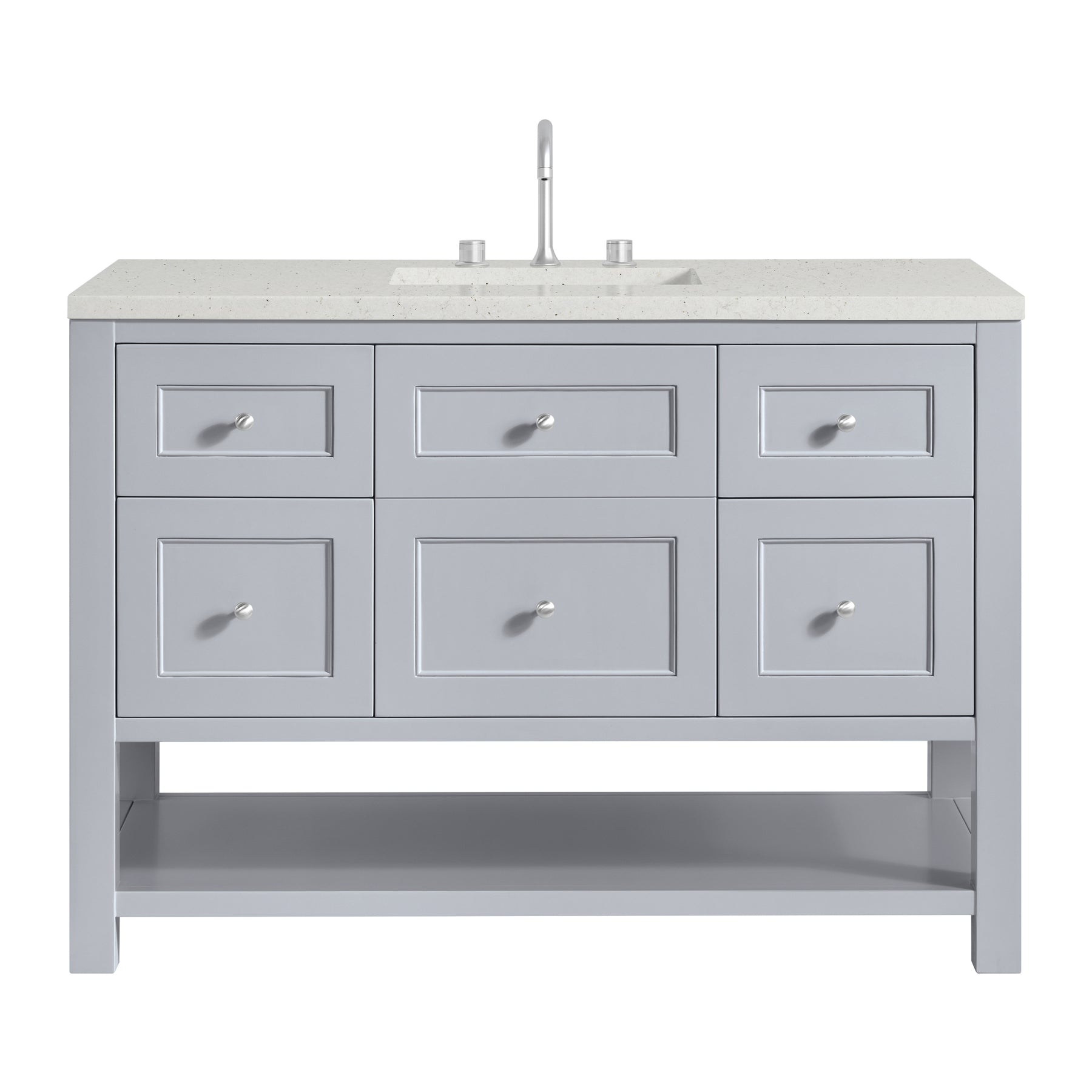 The Breckenridge 48" Single Vanity is a fresh take on traditional Mission furniture that easily transitions to Modern Farmhouse style with an air of understated sophistication. Satin Nickel knobs complement the Serenity Blue finish, while the neatly inset door and drawer fronts lend a fresh appeal to this clean-lined classic. A single-door cabinet opens to reveal an interior shelf equipped with convenient built-in USB/120V power outlet. This console-style vanity also features four full-extension drawers and an open lower shelf for additional storage. A suede-finished Lime Delight Silestone top with undermount sink completes the look.